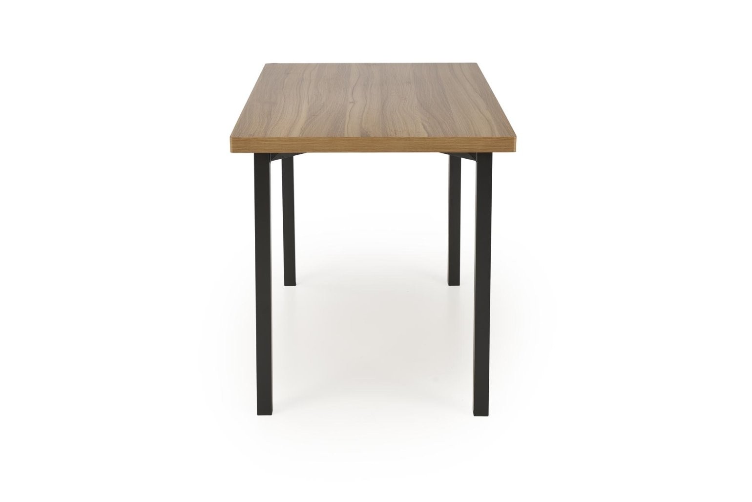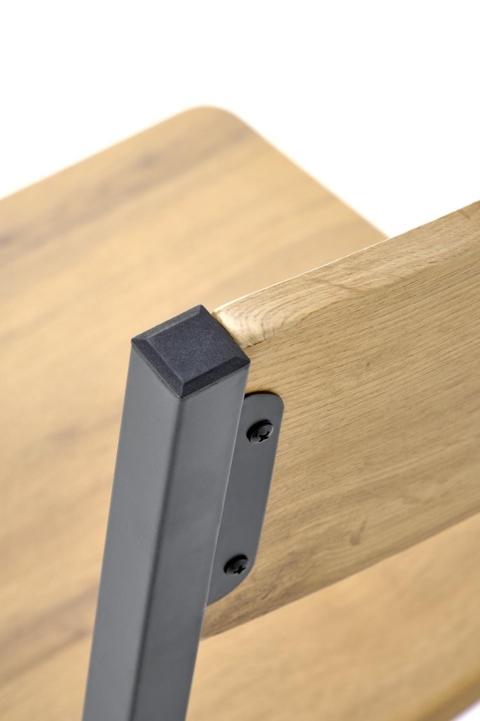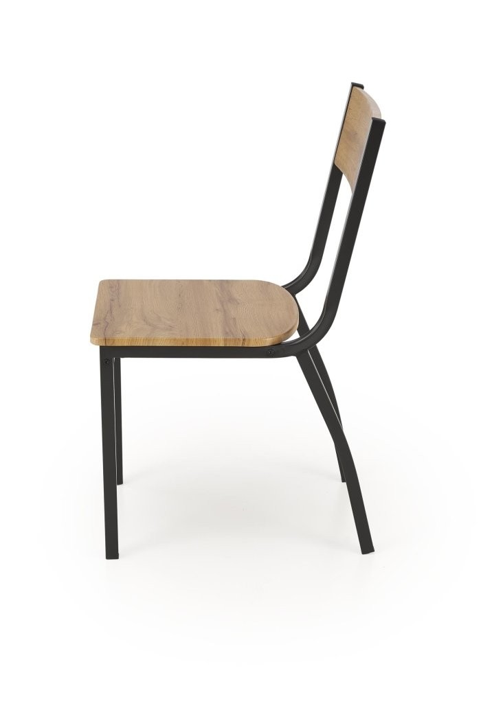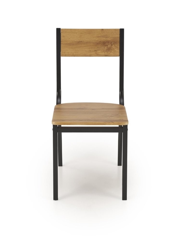 Blagovaonski set Inar, koji uključuje stol i četiri stolice, s crnim metalnim okvirom i površinama od laminirane ploče u prirodnom izgledu. Suvremeni dizajn za blagovaonice ili kuhinje.