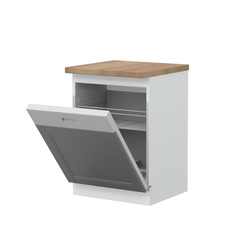 Set uključuje prednju stranu, postolje, pult i ručku za ugradni stroj za pranje posuđa, koja ima vidan panel za upravljanje.U ponudi je u elegantnim bijeloj i grafit boji i u klasičnom dizajnu, koji je uvijek moderan i odlično izgleda u svakom domu. Ima funkciju tihog zatvaranja koja pomaže lakšoj svakodnevnoj uporabi. Stranice nisu uključene!