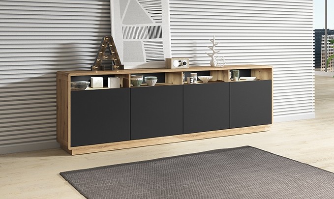 Široka komoda ASTON dostupna je u kombinaciji taurus hrasta i mat crne, koja će uljepšati vaš dnevni boravak. Komoda ima čak četvera vrata i kao rezultat toga sadrži puno prostora za pohranu u koji možete pohraniti svoje društvene igre, časopise i novine.