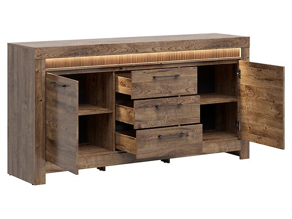 Široka komoda TORIN nudi puno prostora za pohranu, što će vam omogućiti da stvari budu uredne i organizirane. Široka komoda modernog izgleda dostupna je u boji hrasta ribbeck koja će savršeno upotpuniti vaš prostor.
