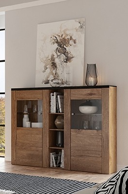 Široka vitrina LARONA sadrži mnogo prostora za pohranu vaših knjiga, društvenih igara, suvenira ili cvijeća, što vaš prostor čini ugodnijim. Vitrina je dostupna u boji hrasta Lefkas.