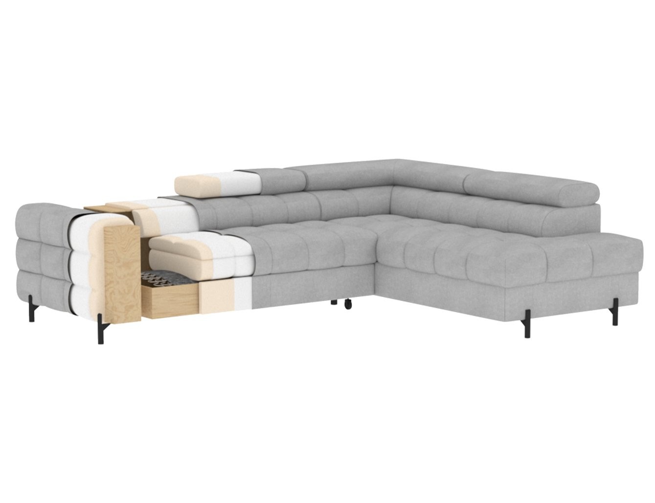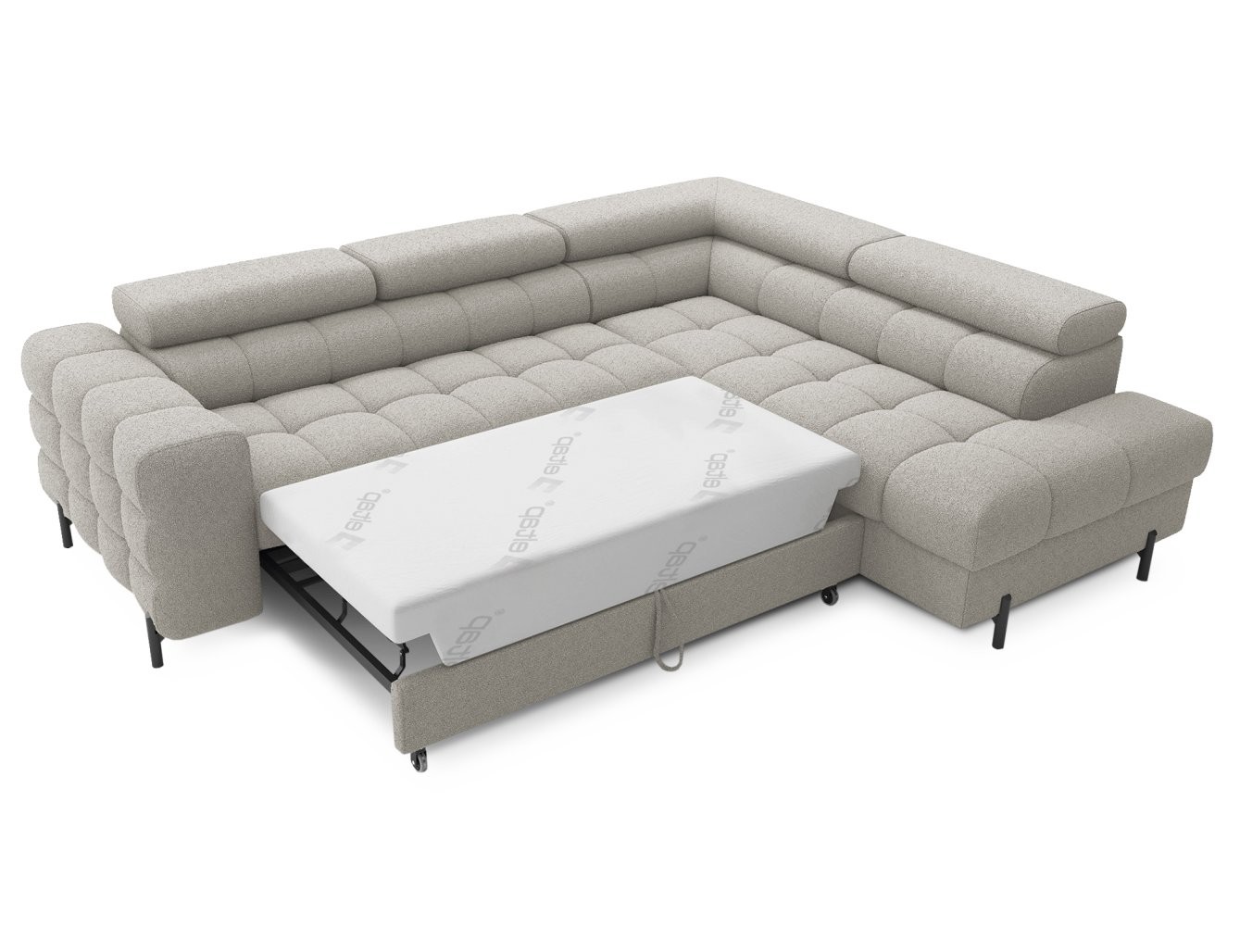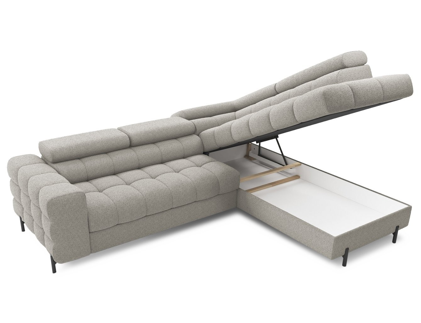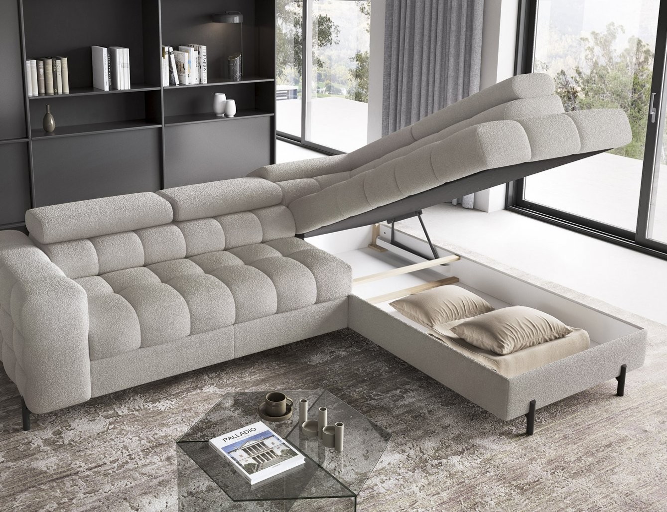 Osim udobnosti, ova garnitura nudi i praktična rješenja za pohranu i funkciju razvlačenja u ležaj. Pomoću mehanizma Dolphin jednostavno i brzo se pretvara u udoban krevet, idealan za neočekivane goste. Ugrađeni prostor za pohranu omogućuje vam da pospremite deke ili druge predmete, održavajući tako urednost vašeg životnog prostora.