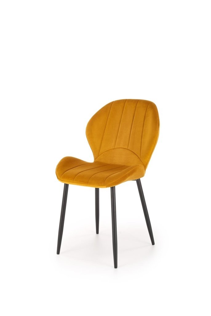 Stol Brion u skandinavskom stilu s presvlakom od baršuna. Dostupan u više boja, uključujući bež, tamno zelenu, crnu, senf i sivu, s crnim metalnim okvirom.