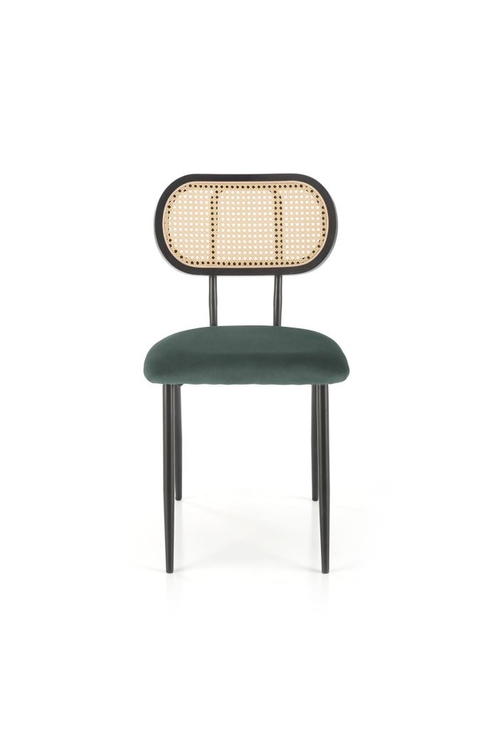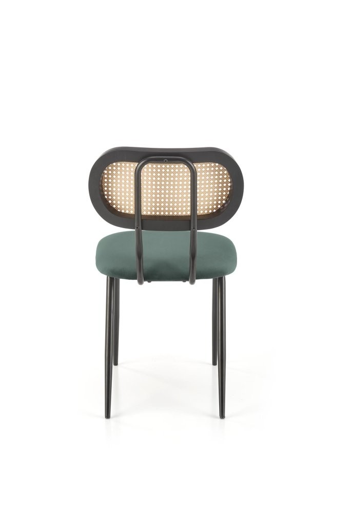 Stol Olenor od tamnozelenog baršuna i umjetnog ratana na metalnom okviru, donosi retro i boho izgled u modernom dizajnu.