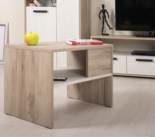 Treba vam jednostavan stolić za dnevnu sobu koji ne zauzima puno prostora? Onda je stolić SYLA 3 izvrstan izbor za vas! SYLA 3 je jednostavan stolić u prekrasnoj kombinaciji bijele i imitacije hrasta, sa stilskom policom u sredini, idealan za odlaganje novina, časopisa i knjiga!