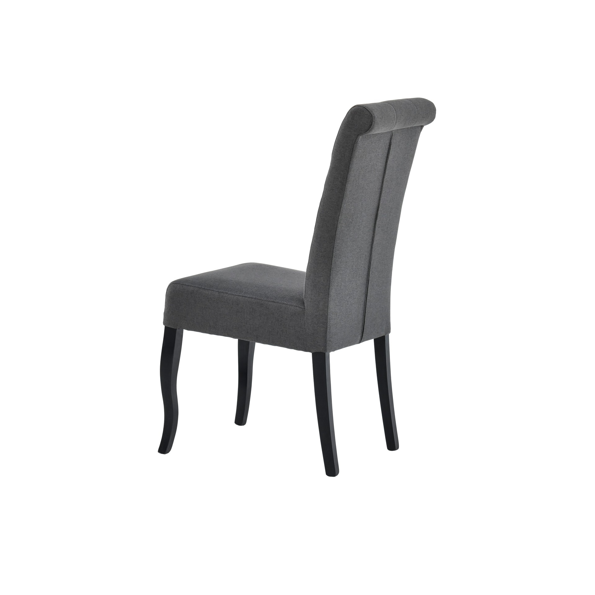 Elegantna i moderna stolica za blagovanje presvučena kvalitetnom tkaninom u tamno sivoj i sa crnim nogama od bukovog drveta. Sjedalo je ispunjeno pjenom, što čini sjedenje ugodnijim. Elegantan izgled stolice osigurava visoki naslon s poplunom u obliku romba. Maksimalna nosivost je 120 kg.
