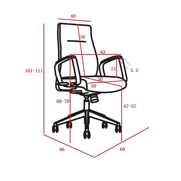 Stolica ima aluminijsko postolje i 5 gumenih kotača u crnoj boji koji sprječavaju ogrebotine i oštećenja poda. Maksimalno opterećenje stolice je 120 kg.