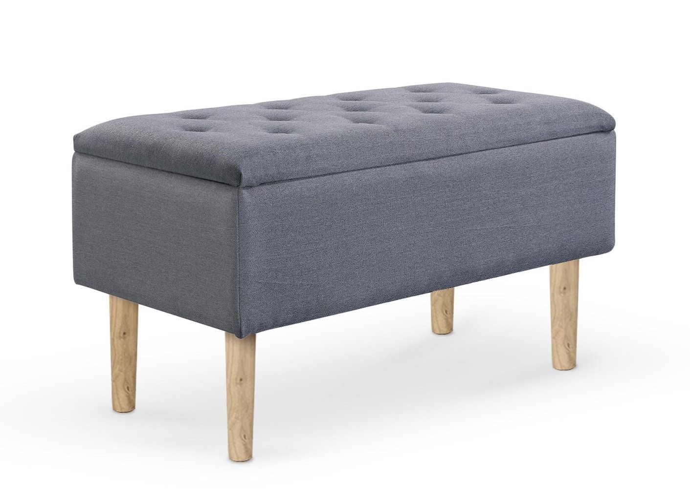 Klupa Jelis u sivoj tkanini s prirodnim drvenim podnožjem. Klasičan stil s funkcionalnim prostorom za pohranu, dimenzija 80 x 40 x 44 cm, savršena za dodatno sjedenje ili pohranu.