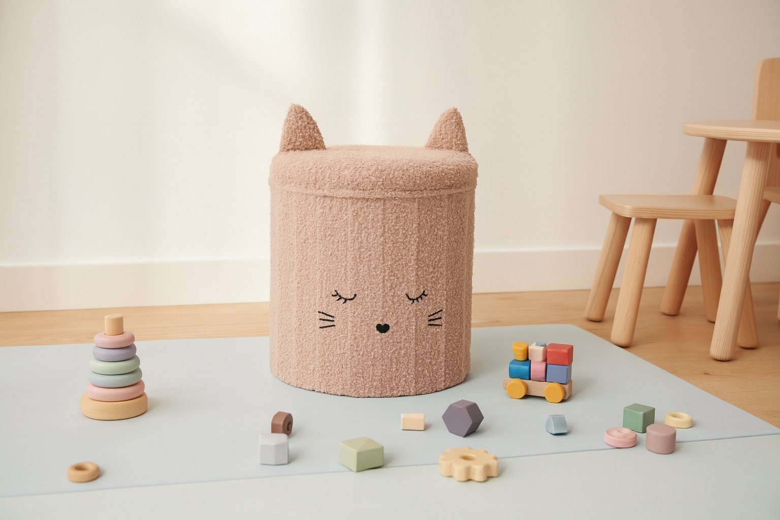 Može se koristiti kao dodatno sjedište, oslonac za noge ili kao dekorativan naglasak u dnevnom boravku, spavaćoj ili dječjoj sobi. Ugrađeni prostor za pohranu doprinosi urednijem prostoru. Sklopiva izvedba omogućuje jednostavno spremanje i uštedu prostora kada proizvod nije u upotrebi. Dimenzije 28 × 28 × 34 cm pomažu pri načrtovanju rasporeda.