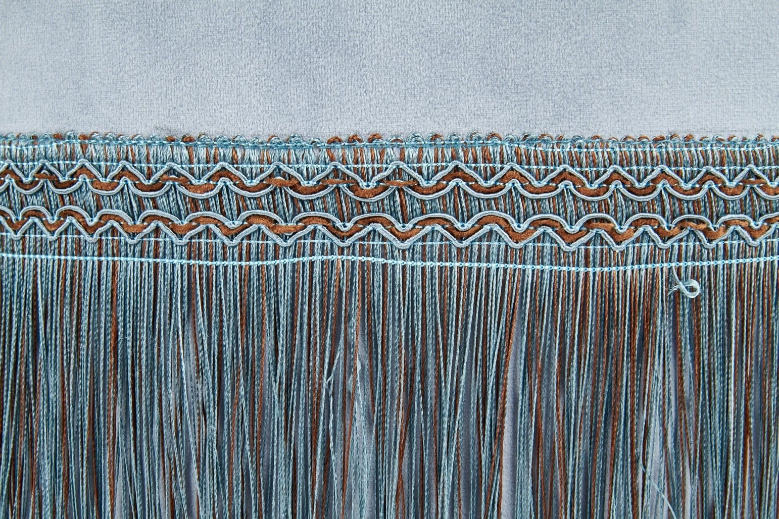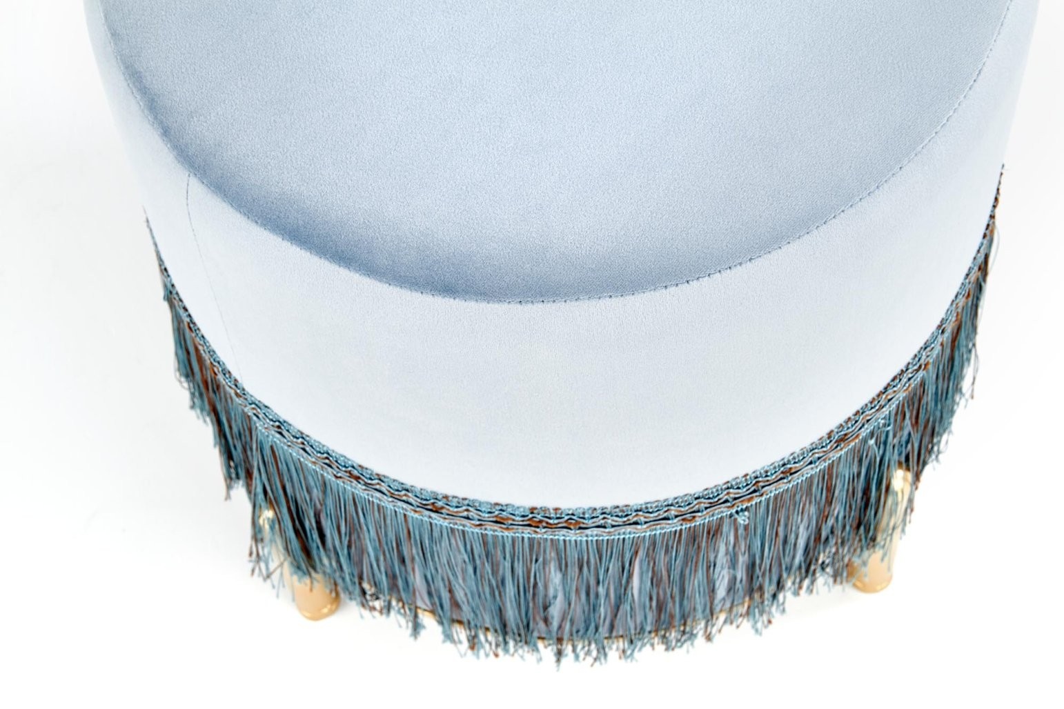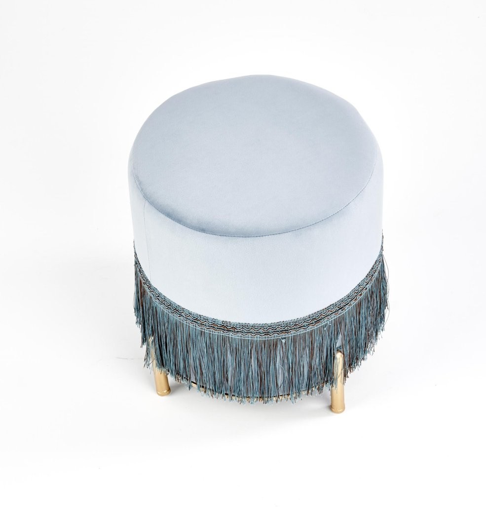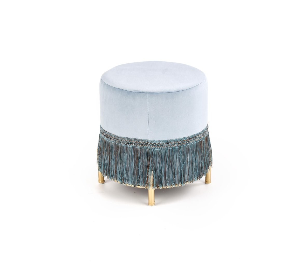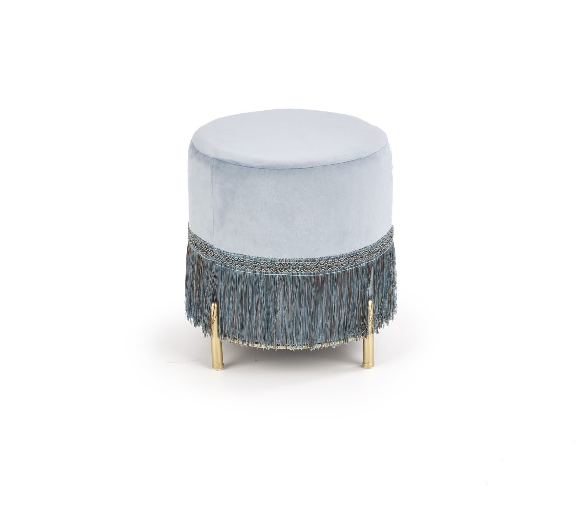 Tabure Olran, elegantan i u boho stilu, donosi svježinu u svaki prostor. Tapeciran u tkanini svijetloplave boje sa zlatnim metalnim postoljem, visine 39 cm i promjera 39 cm.