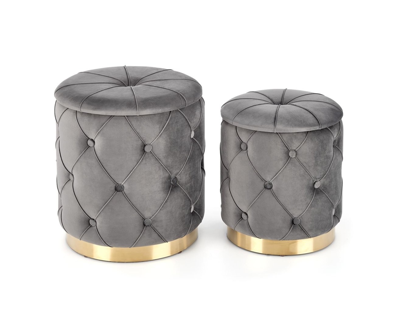 Tabure Rern u kompletu od dva komada, presvučen bordo baršunom i sa zlatnom metalnom bazom. Otmeni prestižni stil s funkcijom pohrane, idealan za elegantne prostore.