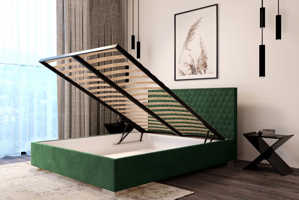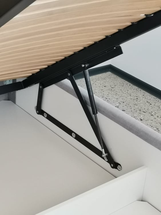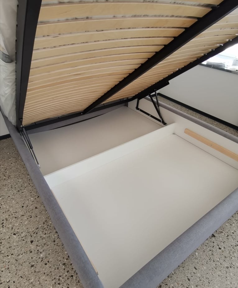 Tapecirani krevet CREATINA ima mehanizam za podizanje koji je jednostavan za korištenje i nudi vam korištenje cijelog prostora ispod kreveta za spremanje posteljine, ljetne odjeće, jastuka i deka te drugih opcionalnih predmeta. Vaši će ormari stoga ostati lijepo uređeni i neće biti pretrpani. Ladica ispod kreveta podijeljena je na dva dijela i visoka je oko 14 cm.