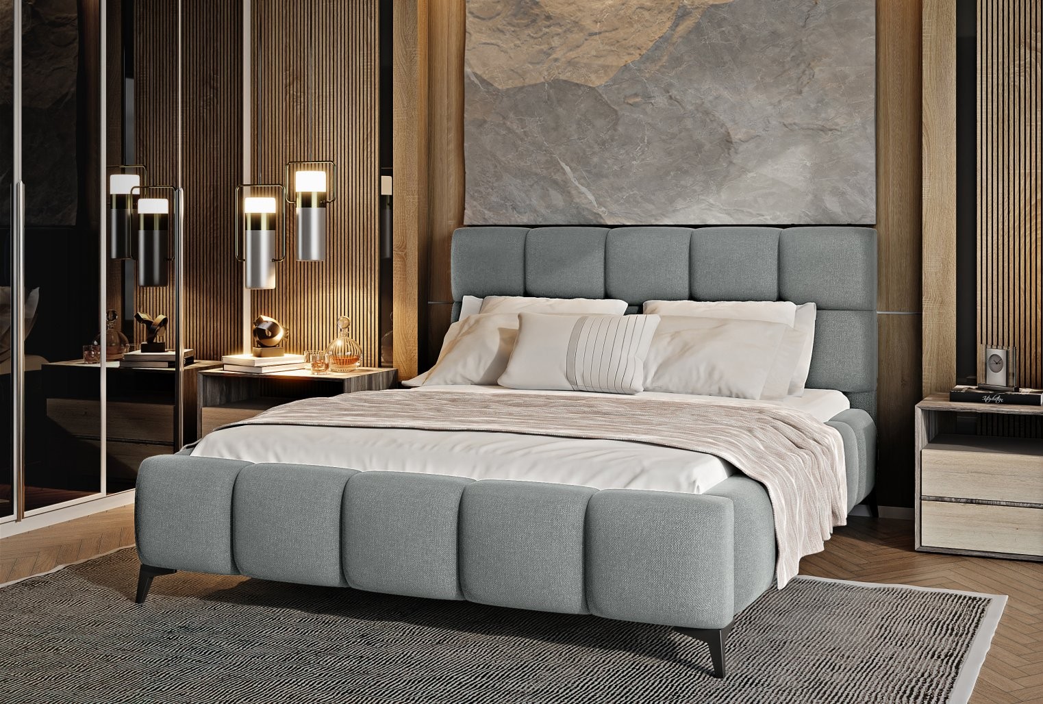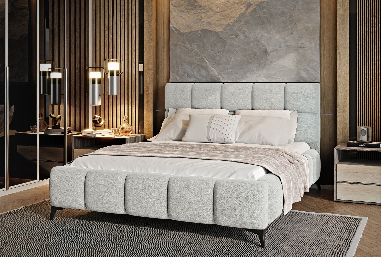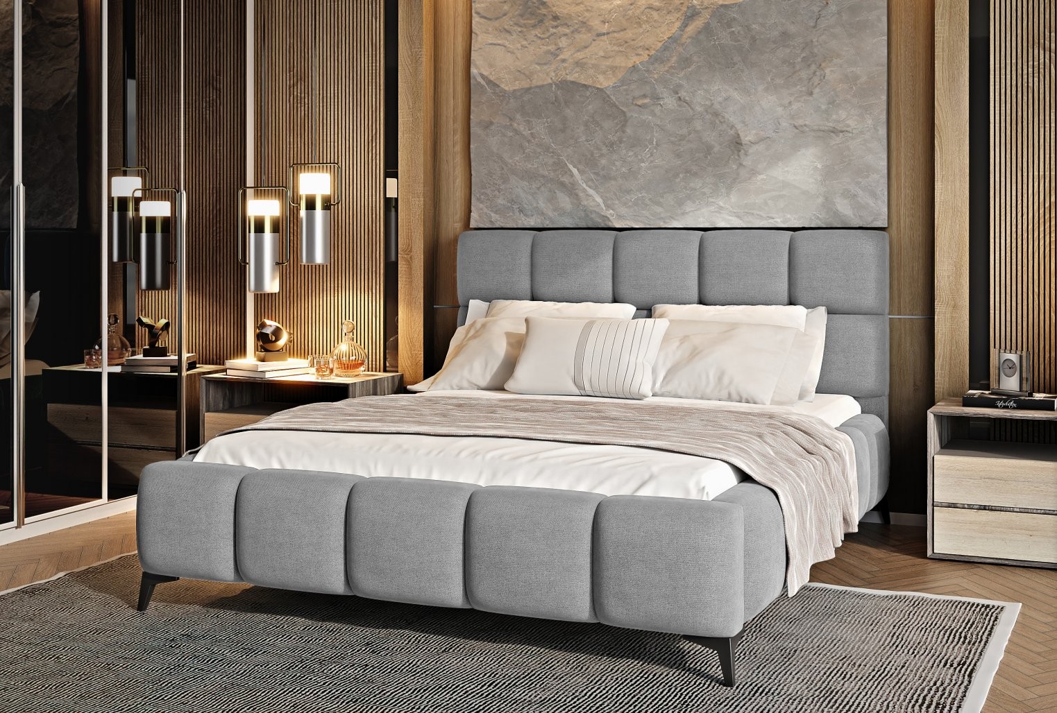 Krevet Mist kombinira moderan dizajn i glamurozan stil, unoseći dašak elegancije u svaku spavaću sobu. Meko tapecirano uzglavlje s kvalitetnom tkaninom i dekorativnim prošivima dodaje prostoru stil i karakter.