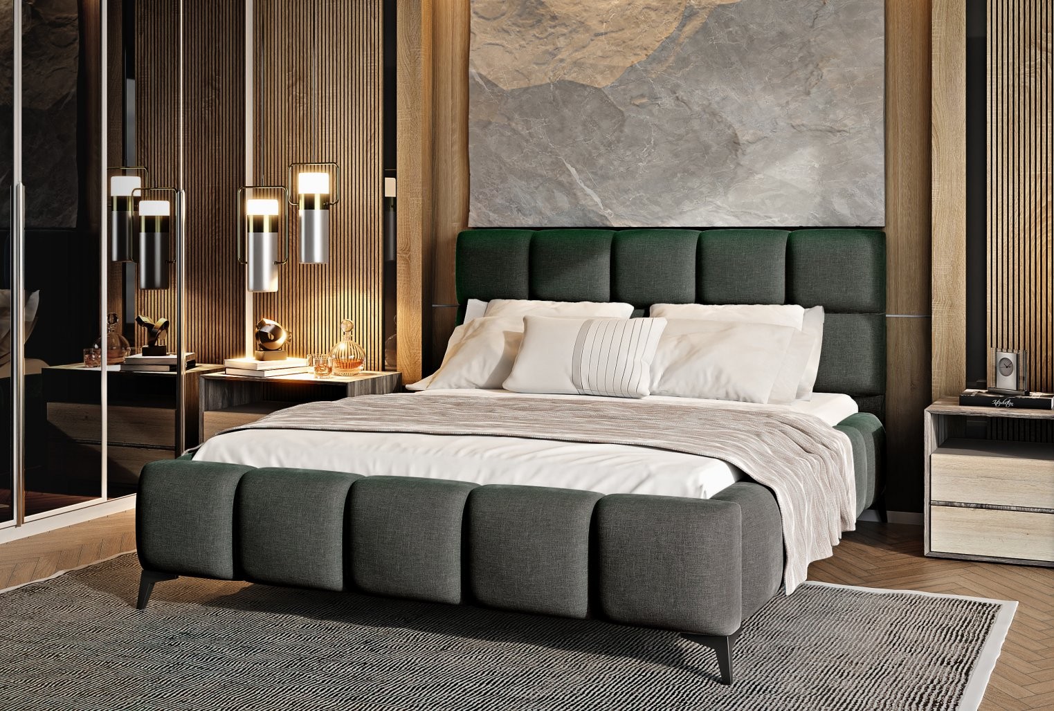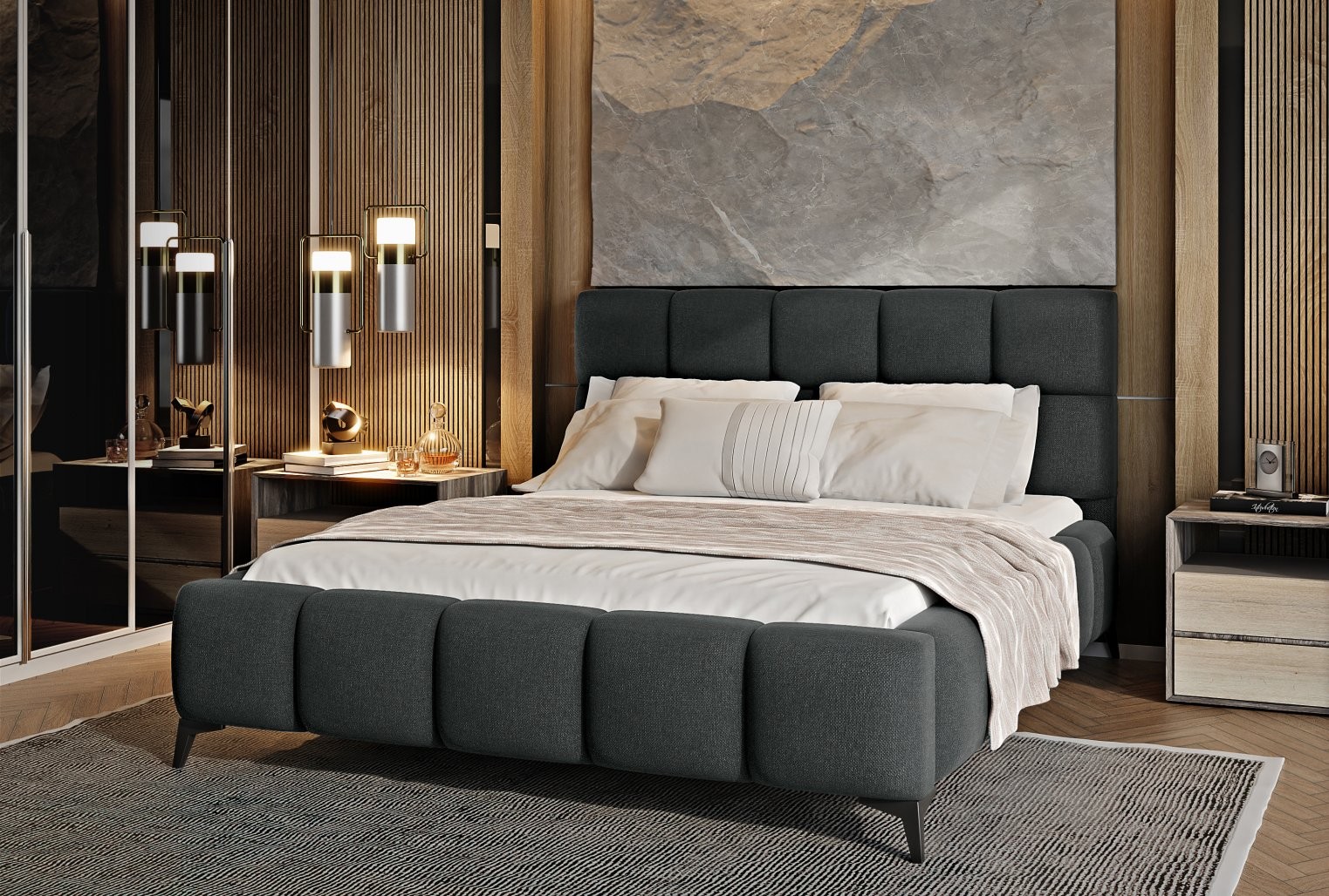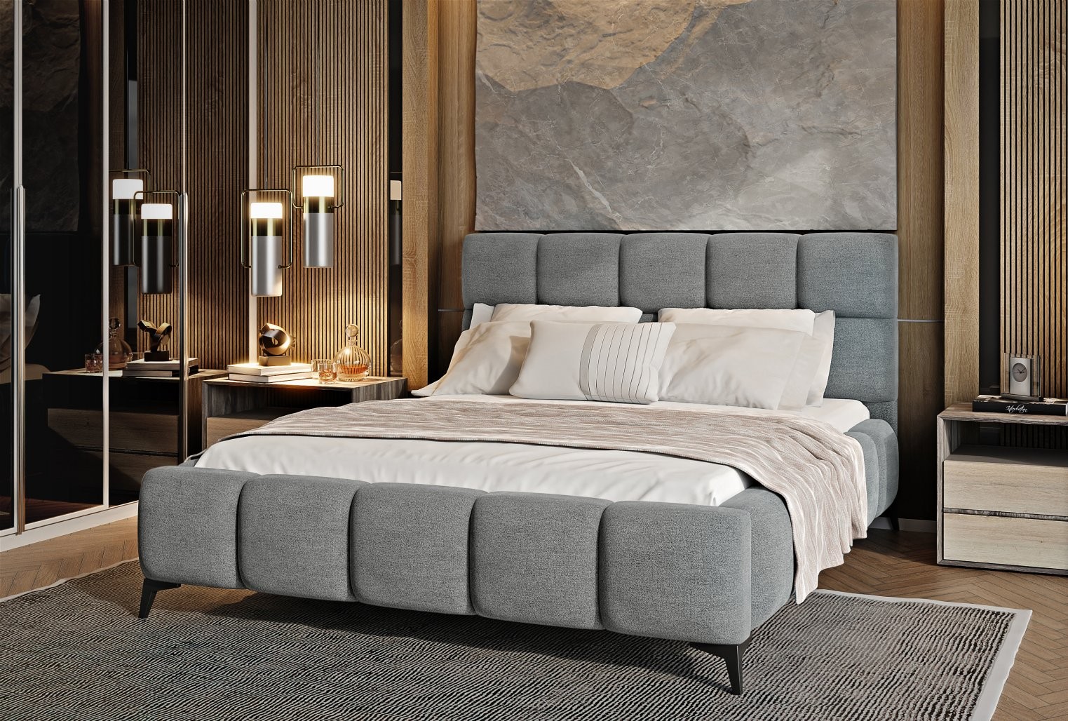 Krevet Mist kombinira moderan dizajn i glamurozan stil, unoseći dašak elegancije u svaku spavaću sobu. Meko tapecirano uzglavlje s kvalitetnom tkaninom i dekorativnim prošivima dodaje prostoru stil i karakter.