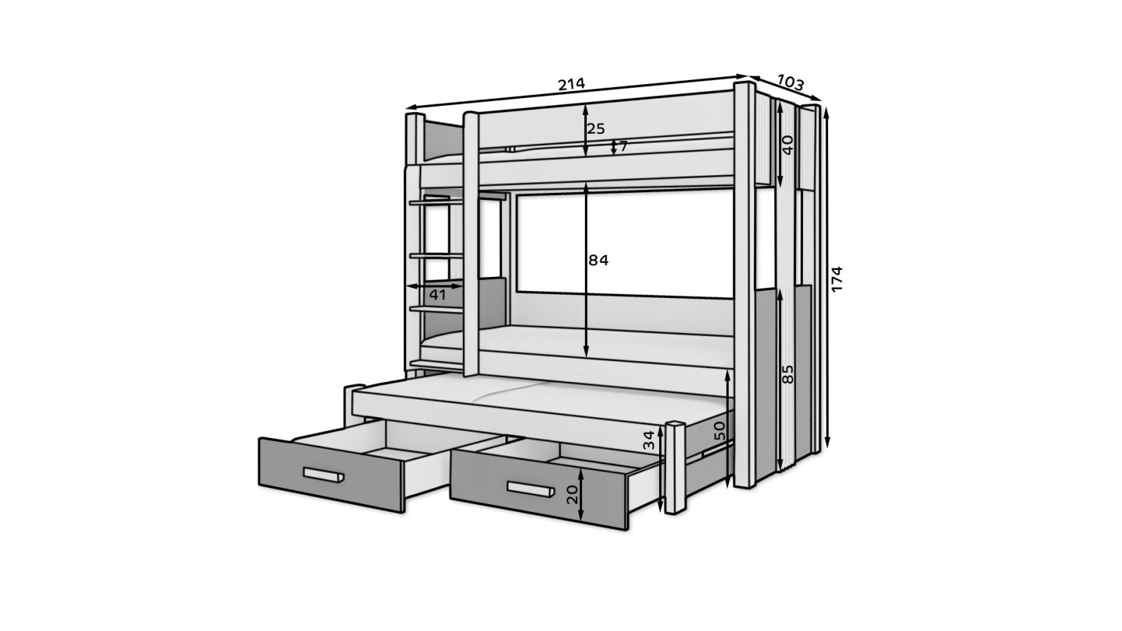 - Ležajevi: Gornji 200x90 cm, Donji 200x90 cm, Izvlačni 190x90 cm