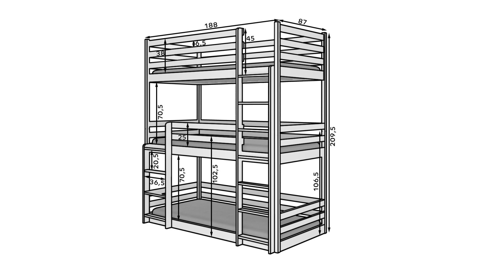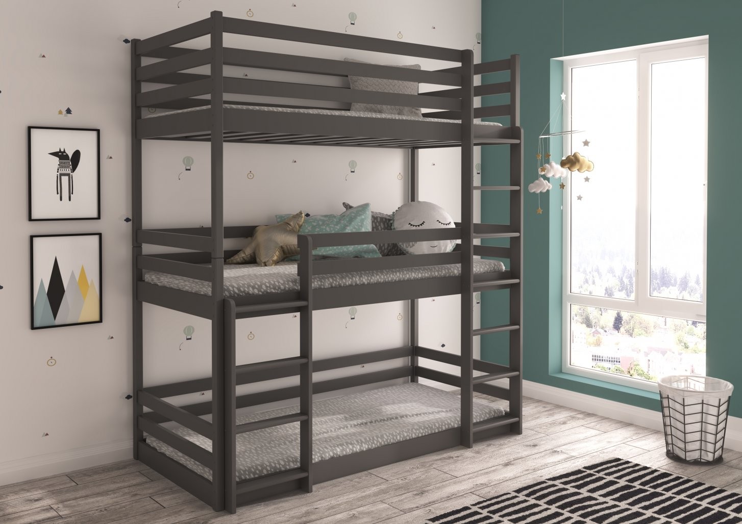 Troslojni dječji krevet TEDRO 200x90 savršeno je rješenje za uštedu prostora u manjim dječjim sobama. Njegov praktičan dizajn omogućuje udoban san za troje djece, pri čemu je svaki ležaj smješten iznad prethodnog radi optimalnog iskorištavanja prostora.