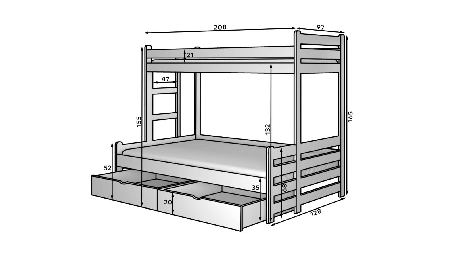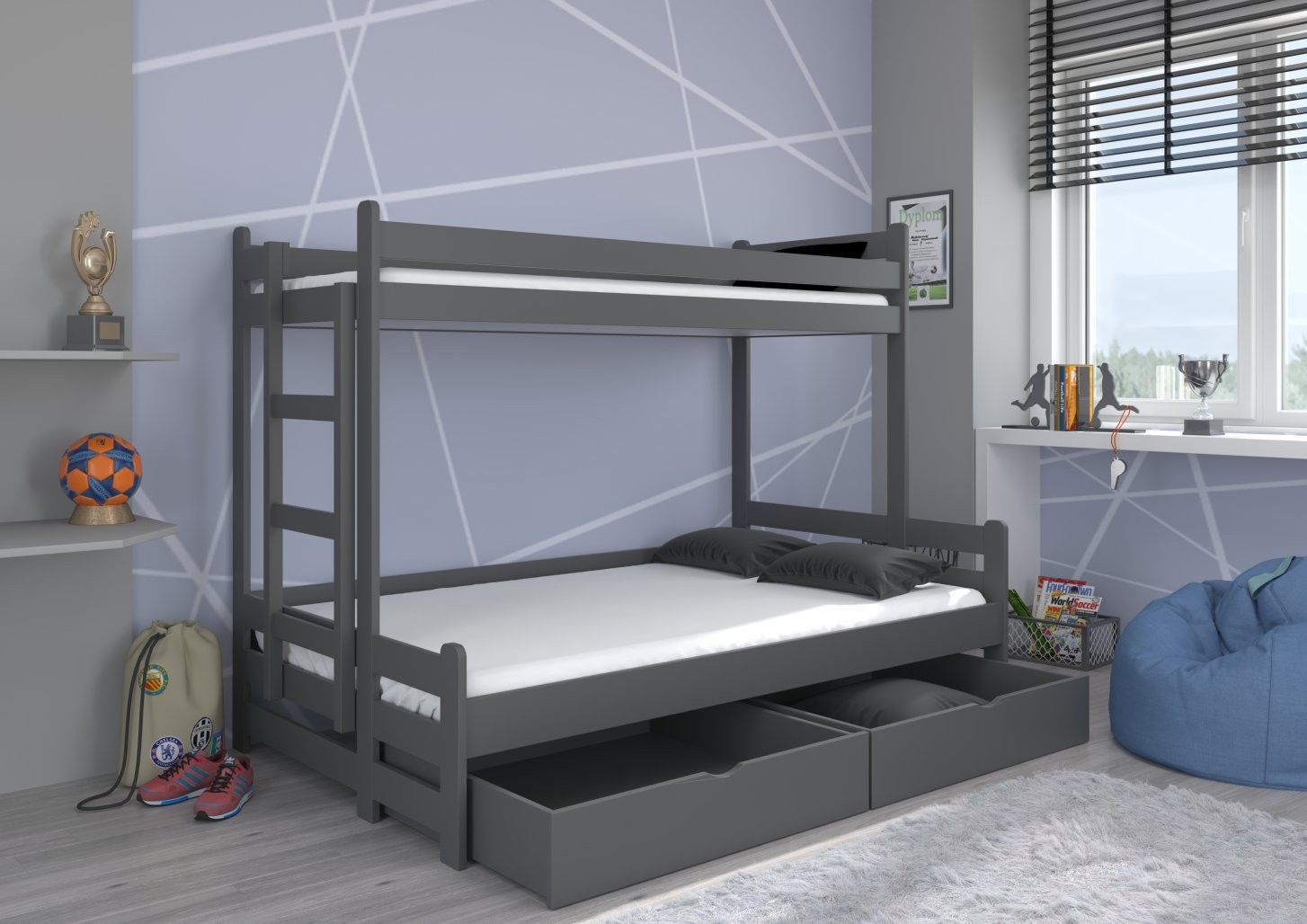 Troslojni krevet BENITO 200x90 savršeno je rješenje za moderne dječje i omladinske sobe gdje je važno uštedjeti prostor. Njegov pametan dizajn omogućuje udoban san za tri osobe i dodatne funkcionalnosti za veću praktičnost.
