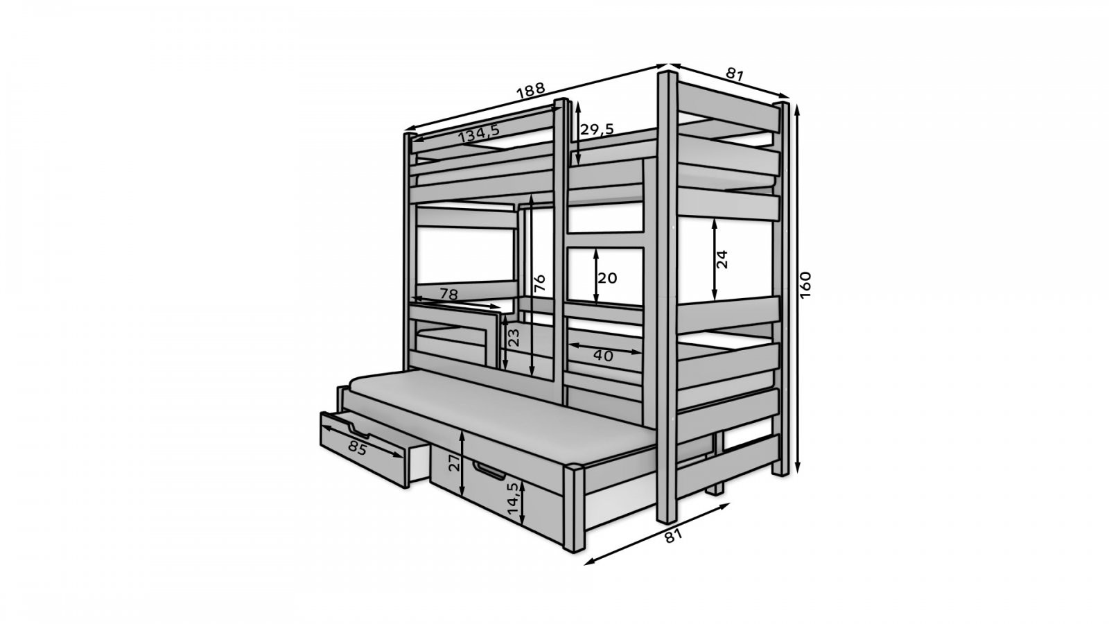 Troslojni krevet na kat za 3 osobe s madracima KARLO savršeno je rješenje za uštedu prostora u dječjoj sobi. Moderan dizajn i funkcionalnost omogućuju sigurno i udobno spavanje za troje djece.