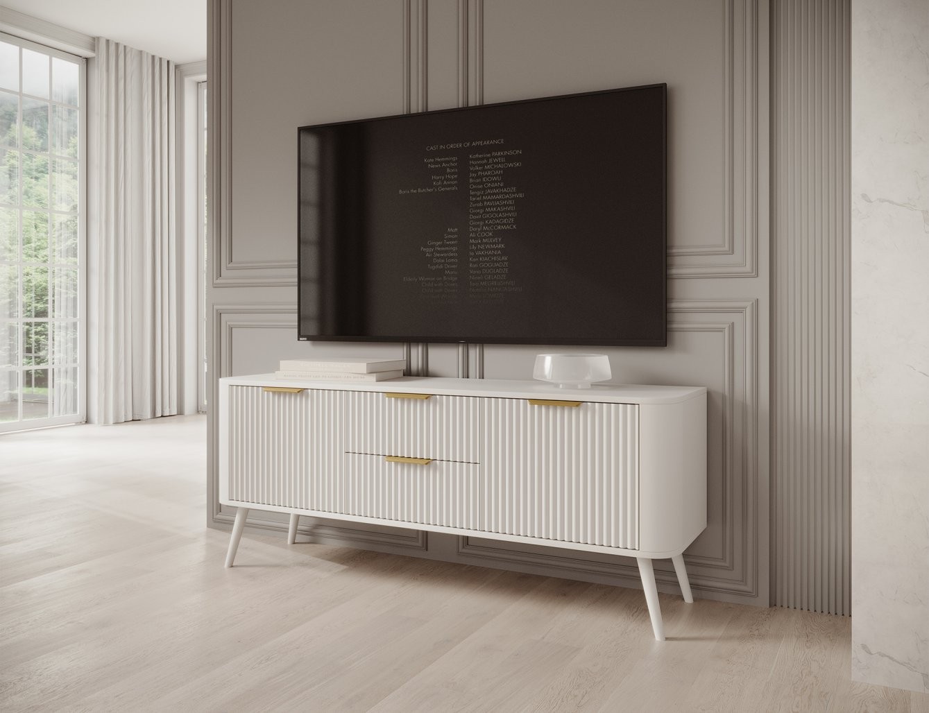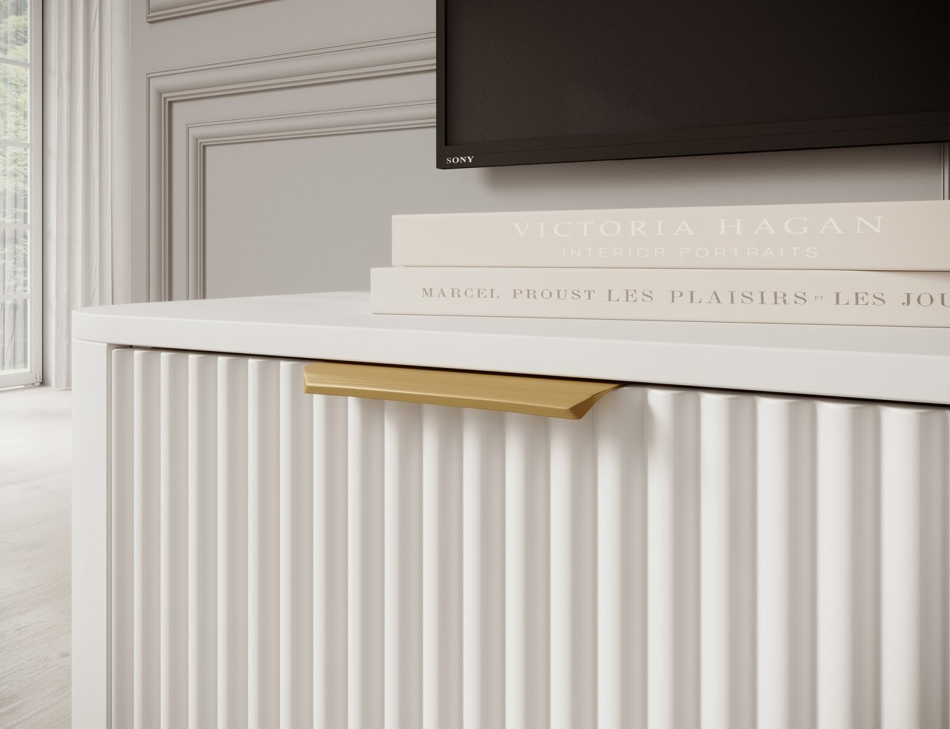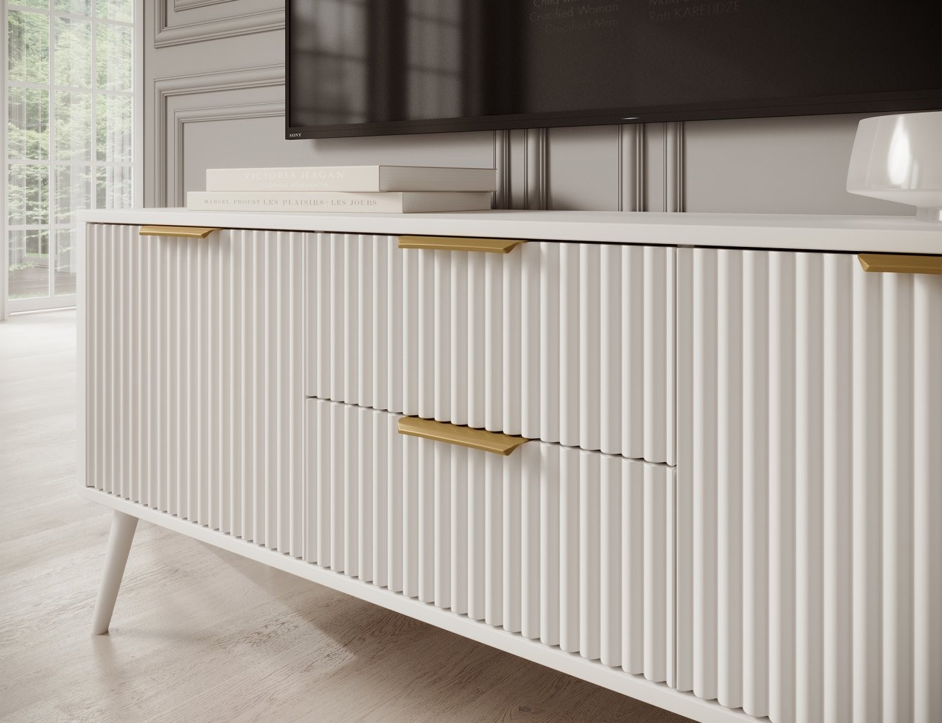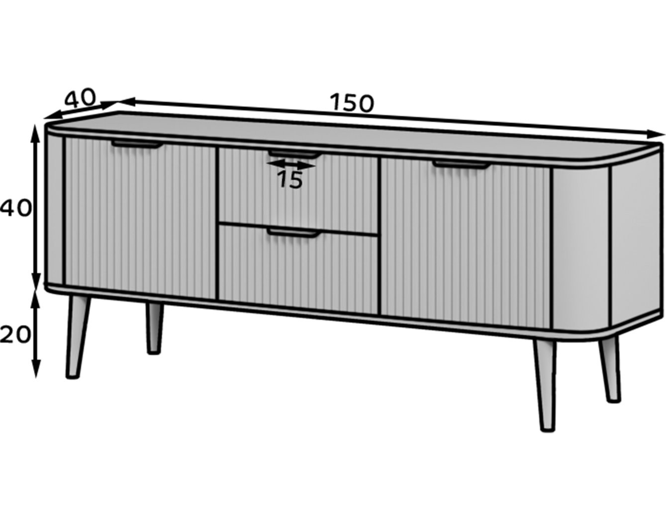 TV komoda Chavelle je elegantan komad namještaja modernog dizajna, idealan za ukusno uređen dnevni boravak. Sa svojim dimenzijama 150x60x40 cm, nudi savršenu kombinaciju stila i funkcionalnosti. Prednja strana je izrađena od izdržljivog MDF-a, obrađenog s ABS rubovima, te se ponosi elegantnim izrezbarenim (rebrastim) uzorkom, što namještaju daje jedinstven pečat. Tijelo od laminirane iverice osigurava vizualnu privlačnost i dugotrajnu izdržljivost.
