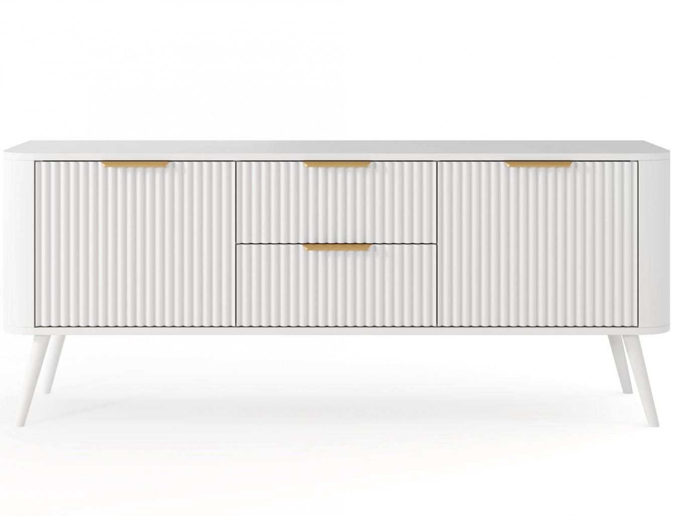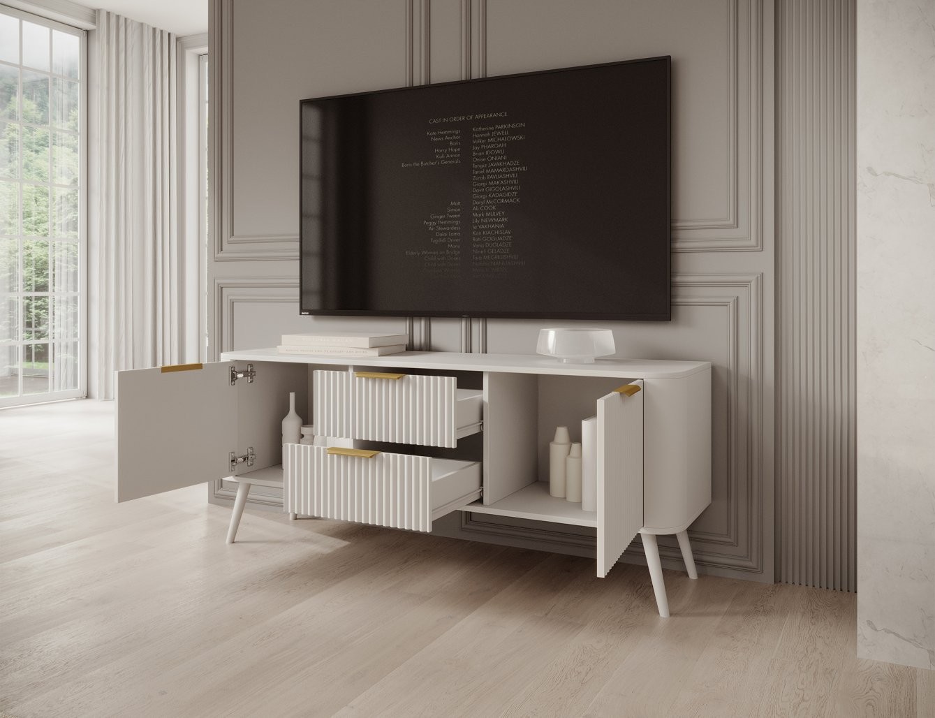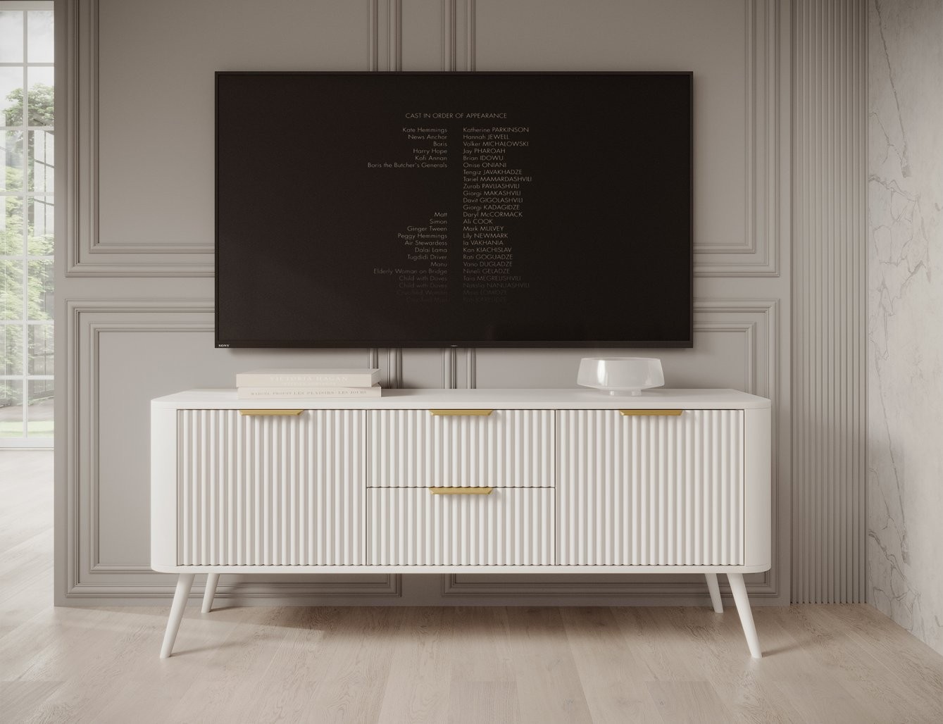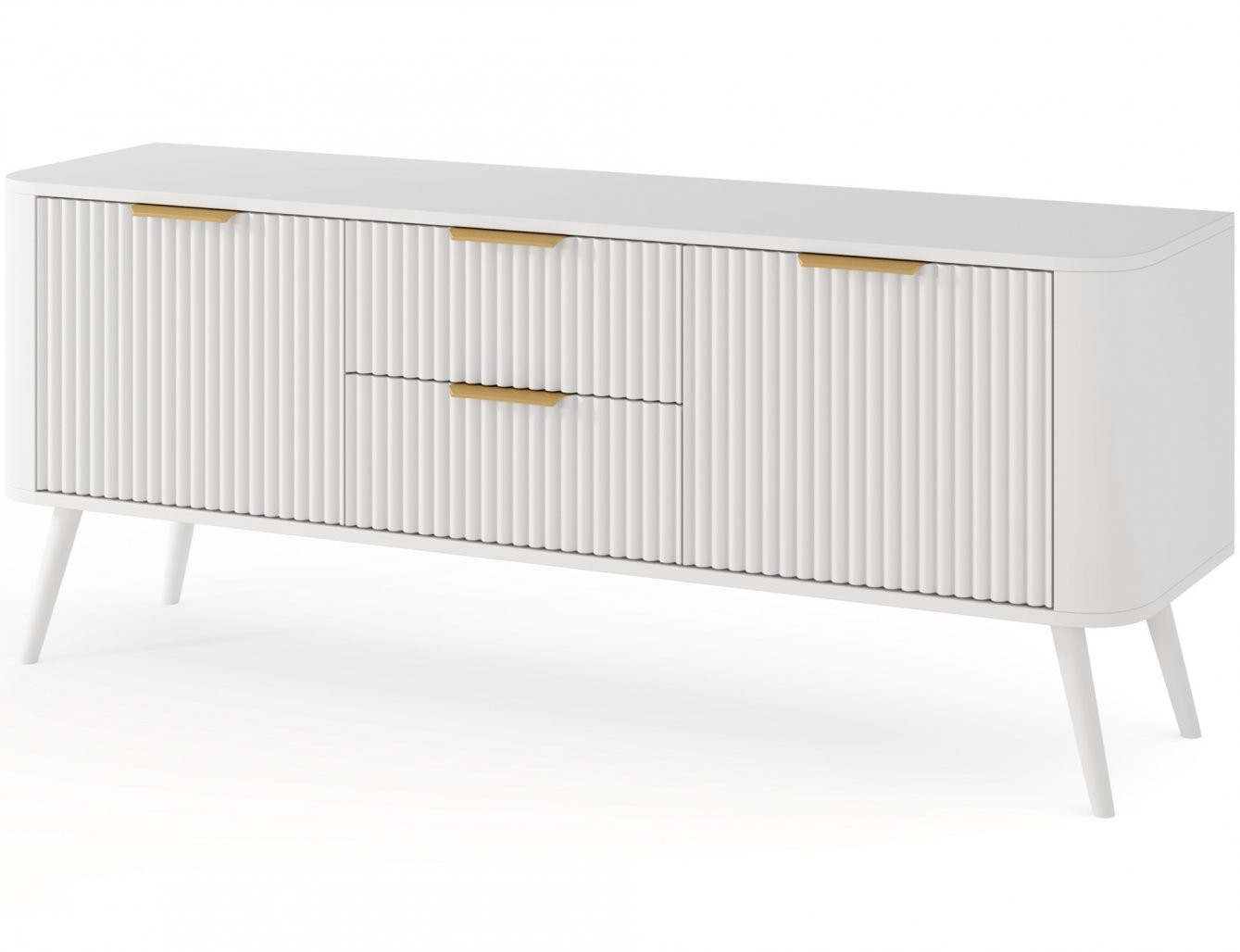 TV komoda Chavelle je elegantan komad namještaja modernog dizajna, idealan za ukusno uređen dnevni boravak. Sa svojim dimenzijama 150x60x40 cm, nudi savršenu kombinaciju stila i funkcionalnosti. Prednja strana je izrađena od izdržljivog MDF-a, obrađenog s ABS rubovima, te se ponosi elegantnim izrezbarenim (rebrastim) uzorkom, što namještaju daje jedinstven pečat. Tijelo od laminirane iverice osigurava vizualnu privlačnost i dugotrajnu izdržljivost.