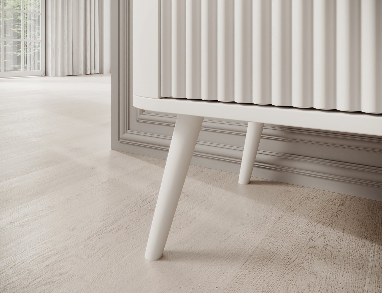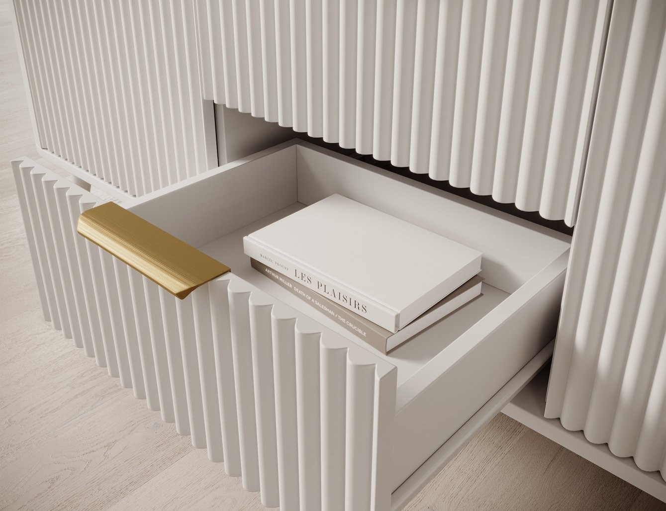 Komoda uključuje dvije prostrane ladice na valjkastim vodilicama, koje omogućuju udobnu i tihu upotrebu. Visoke bijele drvene noge (20 cm) unose osjećaj lakoće i olakšavaju čišćenje ispod komode. Eleganciji doprinose i zlatne metalne ručke, koje dodaju moderan i profinjen završetak cjelokupnom izgledu.