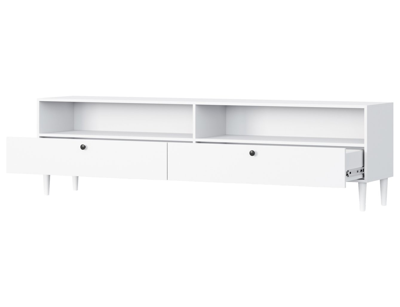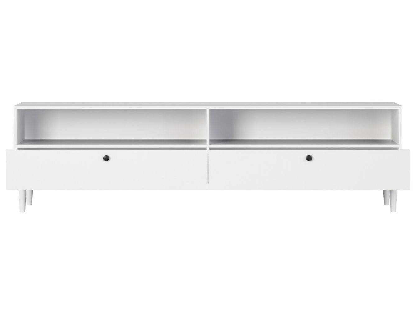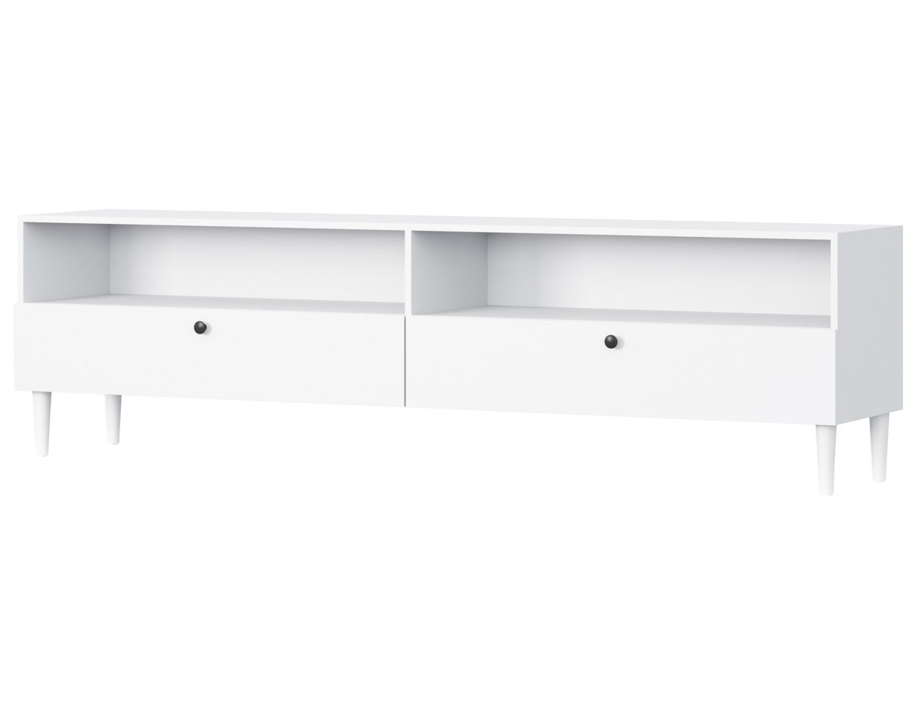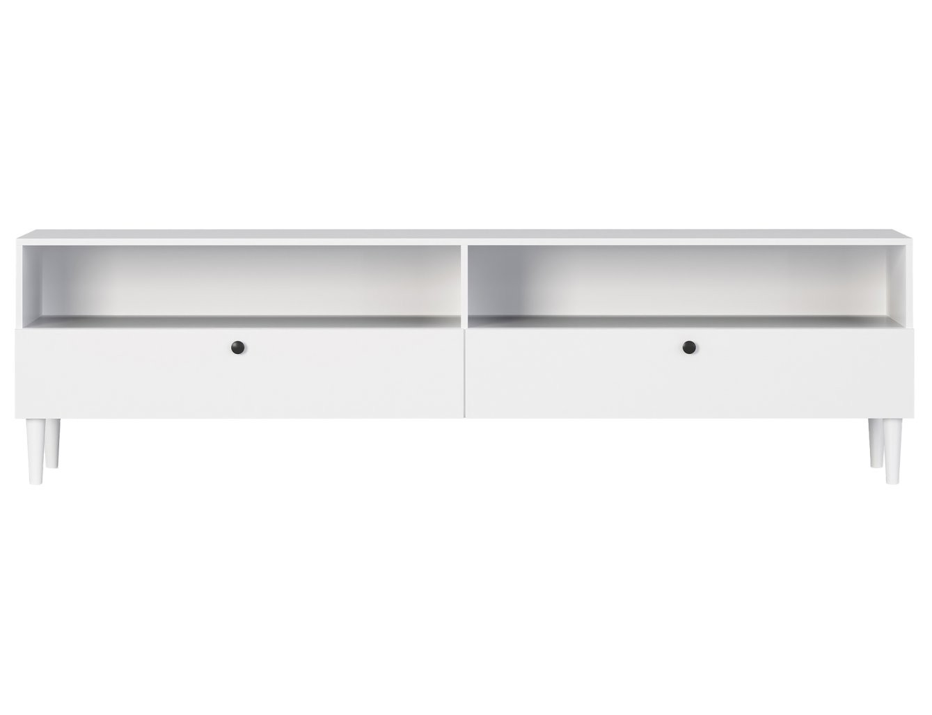 Ova TV komoda dizajnirana je za praktično i estetsko spremanje. Opremljena je s dvije otvorene police koje su idealne za postavljanje multimedijskih uređaja poput igraćih konzola ili prijemnika, te s dvije ladice koje pružaju diskretan prostor za odlaganje manjih, ali bitnih predmeta, kao što su daljinski upravljači i časopisi.