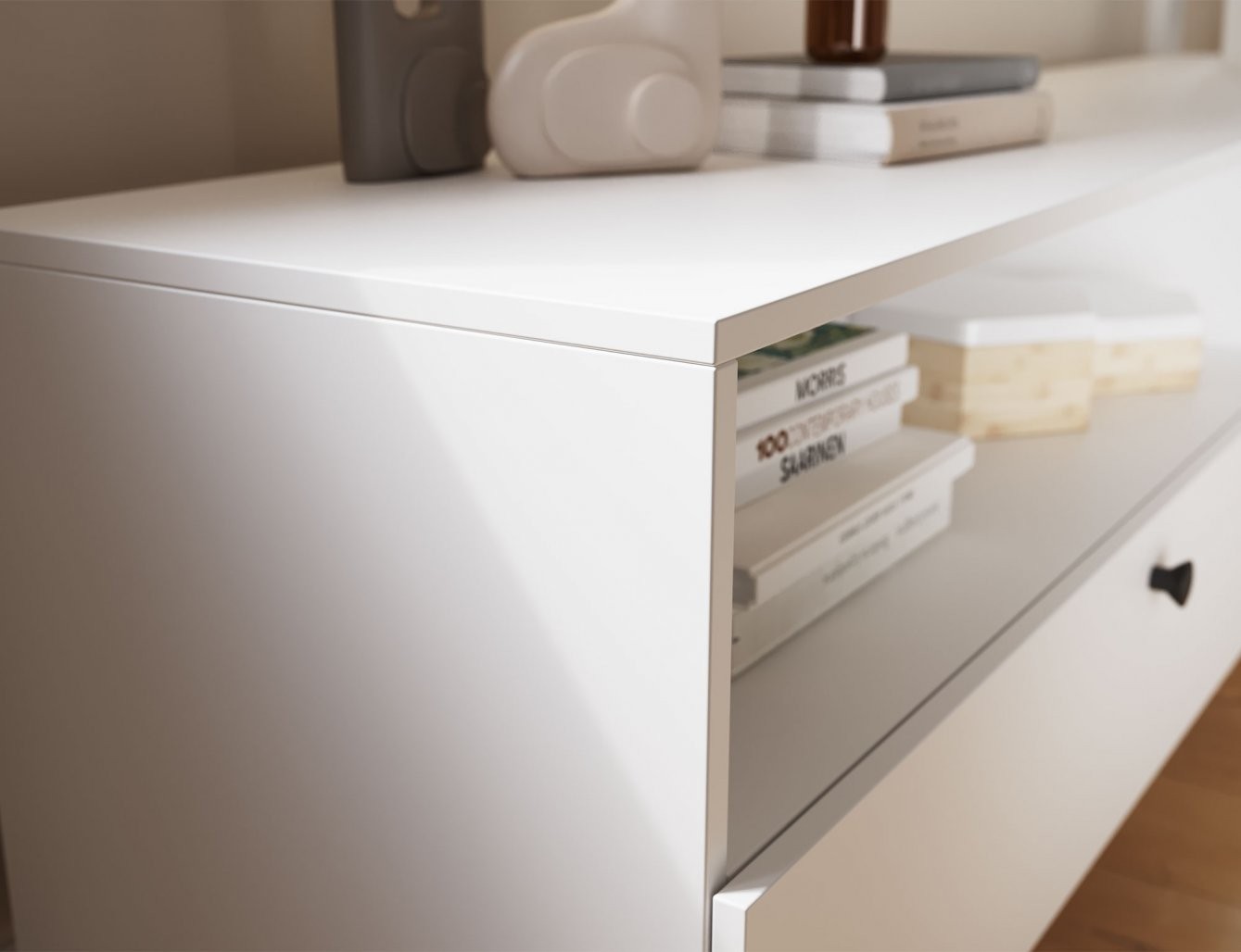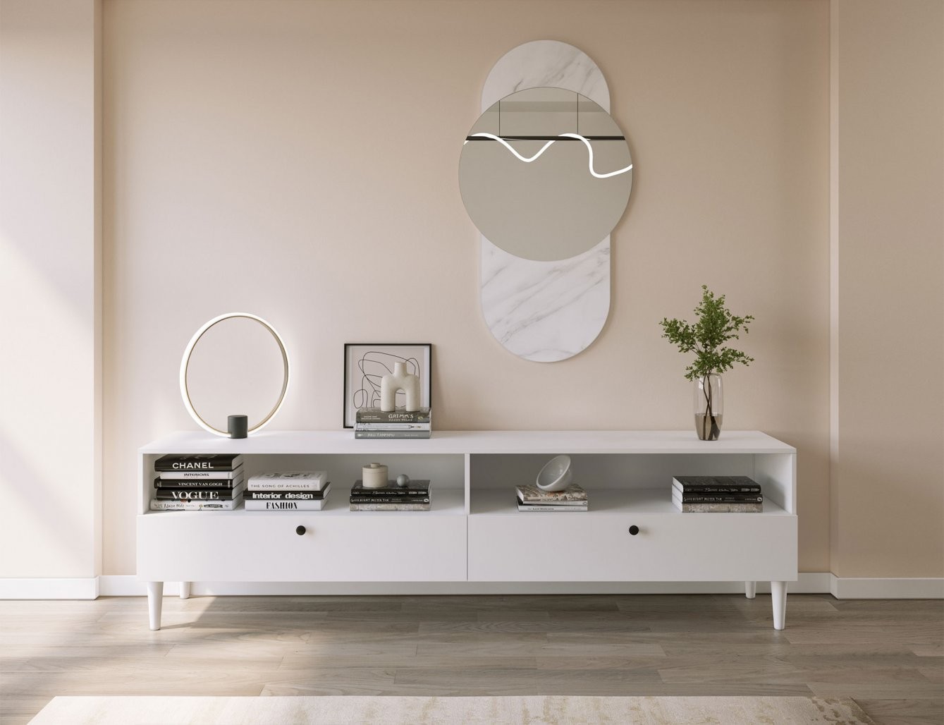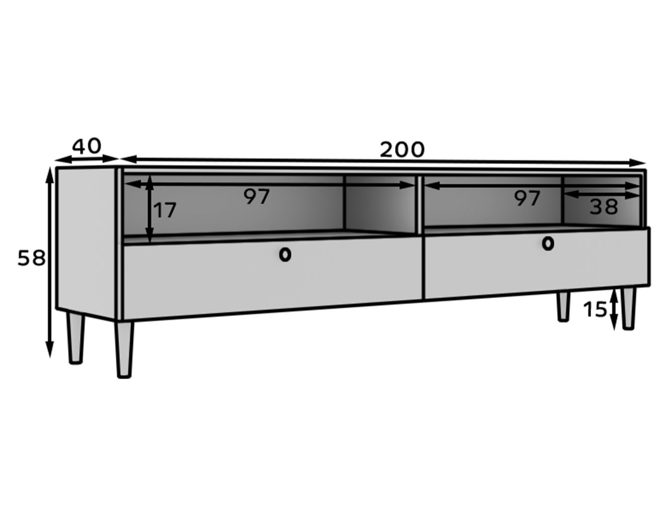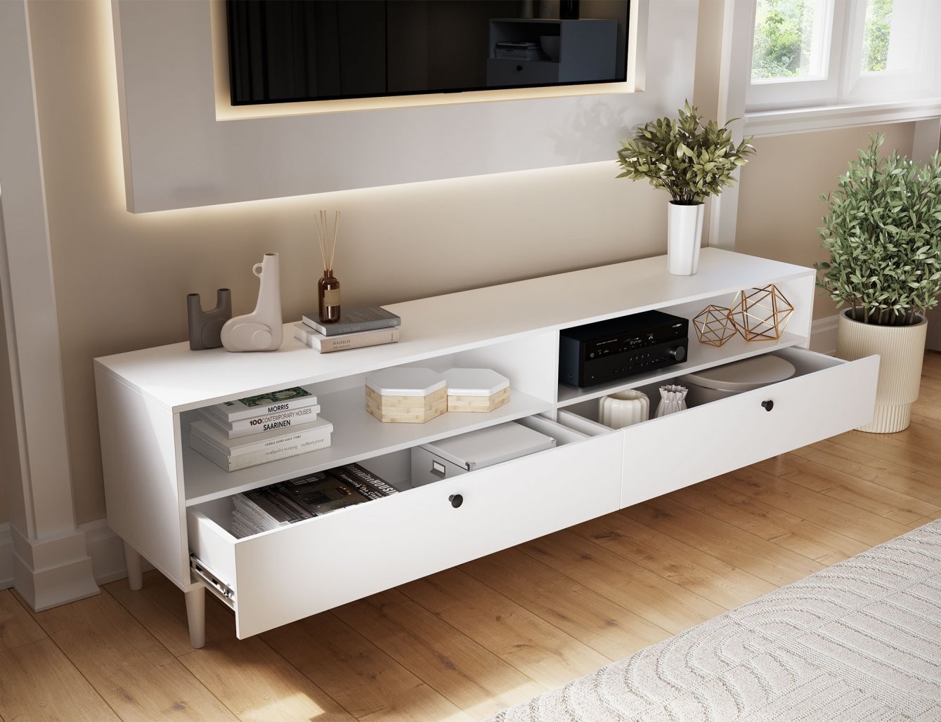 Ova TV komoda dizajnirana je za praktično i estetsko spremanje. Opremljena je s dvije otvorene police koje su idealne za postavljanje multimedijskih uređaja poput igraćih konzola ili prijemnika, te s dvije ladice koje pružaju diskretan prostor za odlaganje manjih, ali bitnih predmeta, kao što su daljinski upravljači i časopisi.