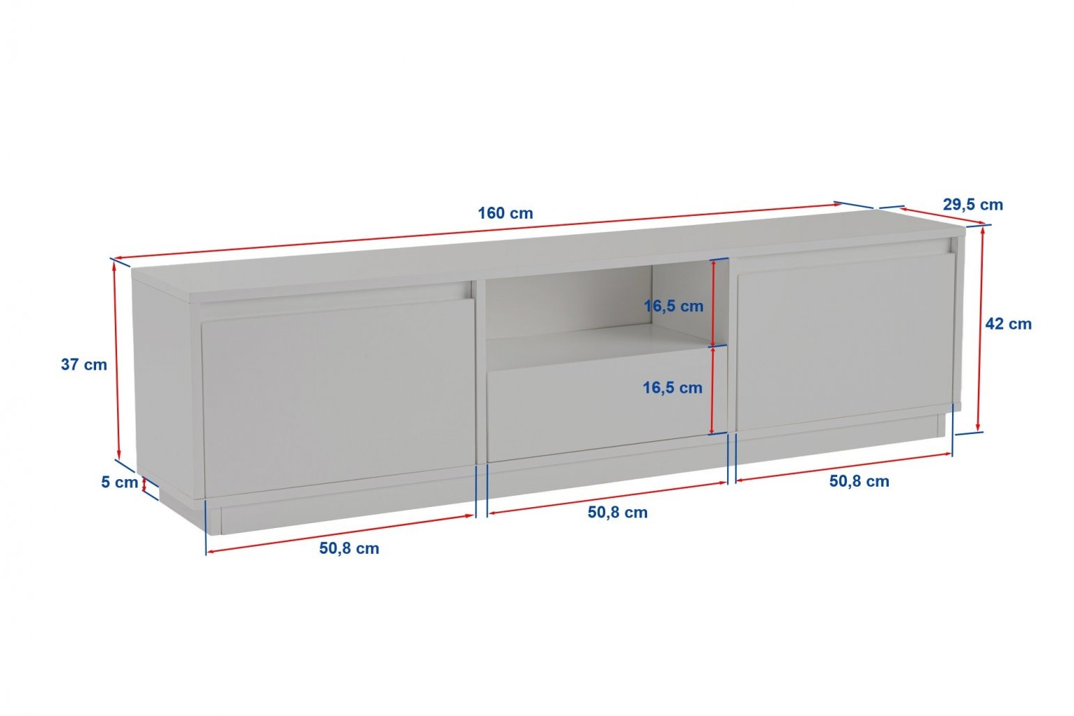 Sa širinom od 160 cm, visinom od 42 cm i dubinom od 29,5 cm, ova TV komoda je idealne veličine za većinu dnevnih boravaka. Pruža dovoljno prostora za televizor, multimedijske uređaje i ostale potrepštine za zabavu, držeći sve organizirano i lako dostupno.