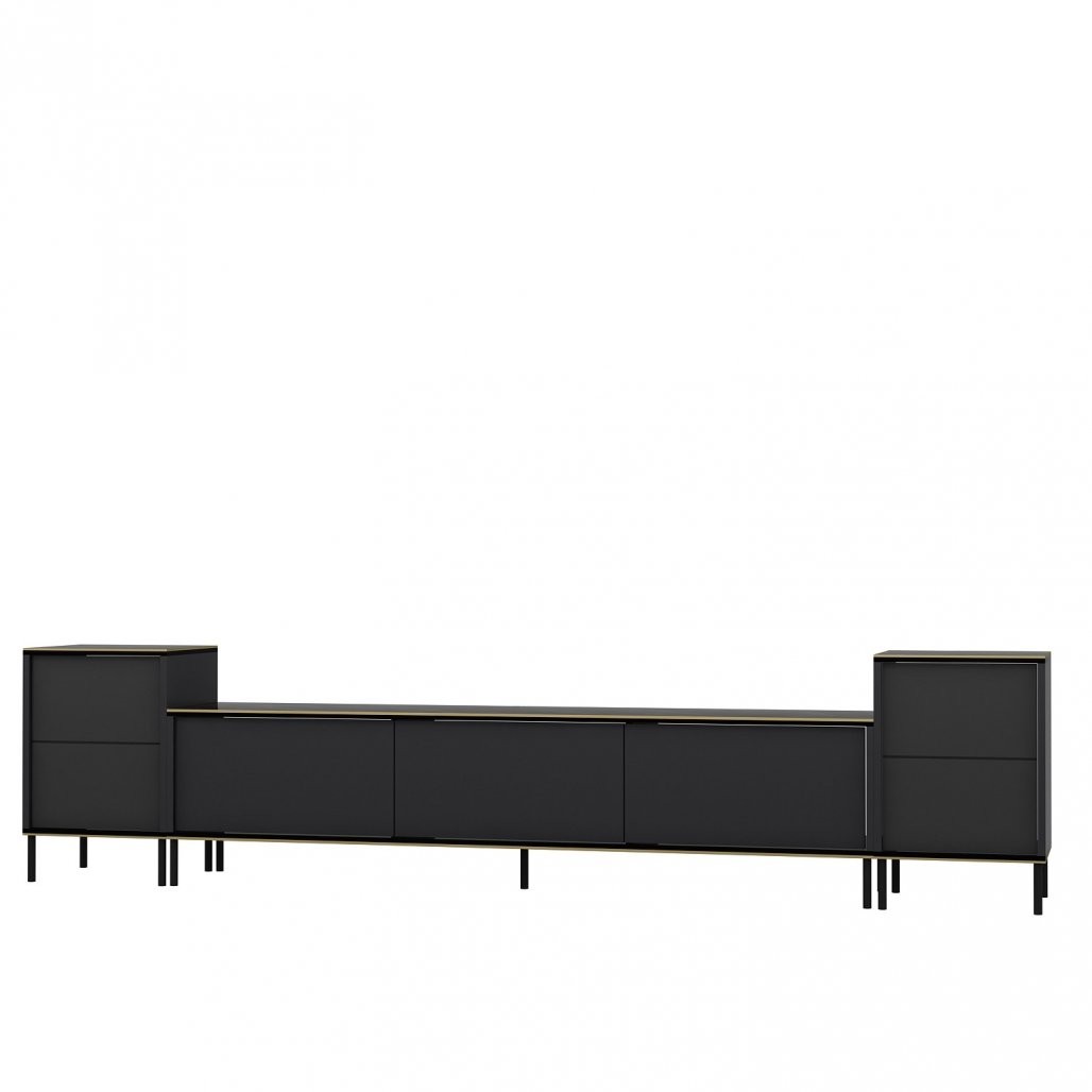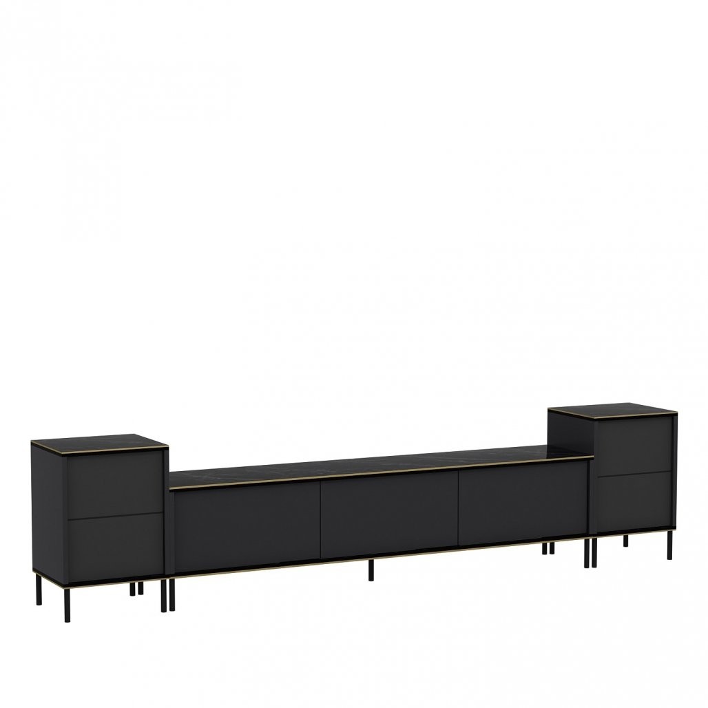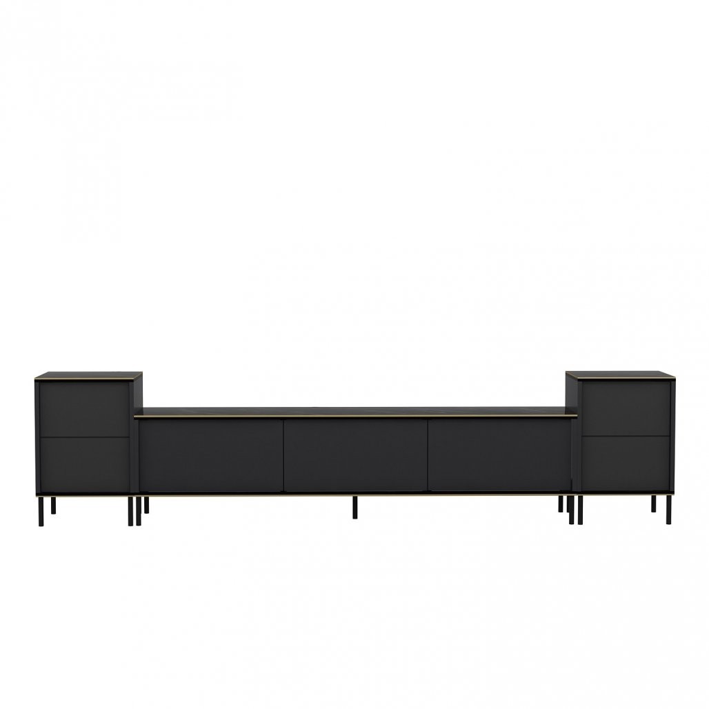 Prostrani TV ormarić dimenzija 180 cm širine, 45,2 cm visine i 35 cm dubine omogućuje jednostavno postavljanje televizora i drugih medijskih uređaja. Dva dodatna ormarića, svaki dimenzija 40 cm širine, 60 cm visine i 35 cm dubine, nude obilje prostora za spremanje DVD-ova, konzola i drugih predmeta. Višestruke police omogućuju uredno organiziranje stvari i održavanje prostora urednim.