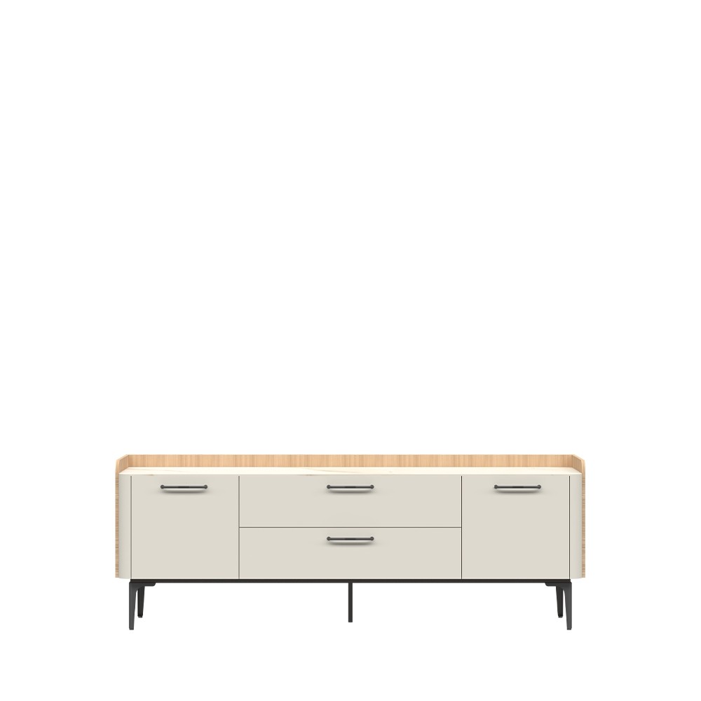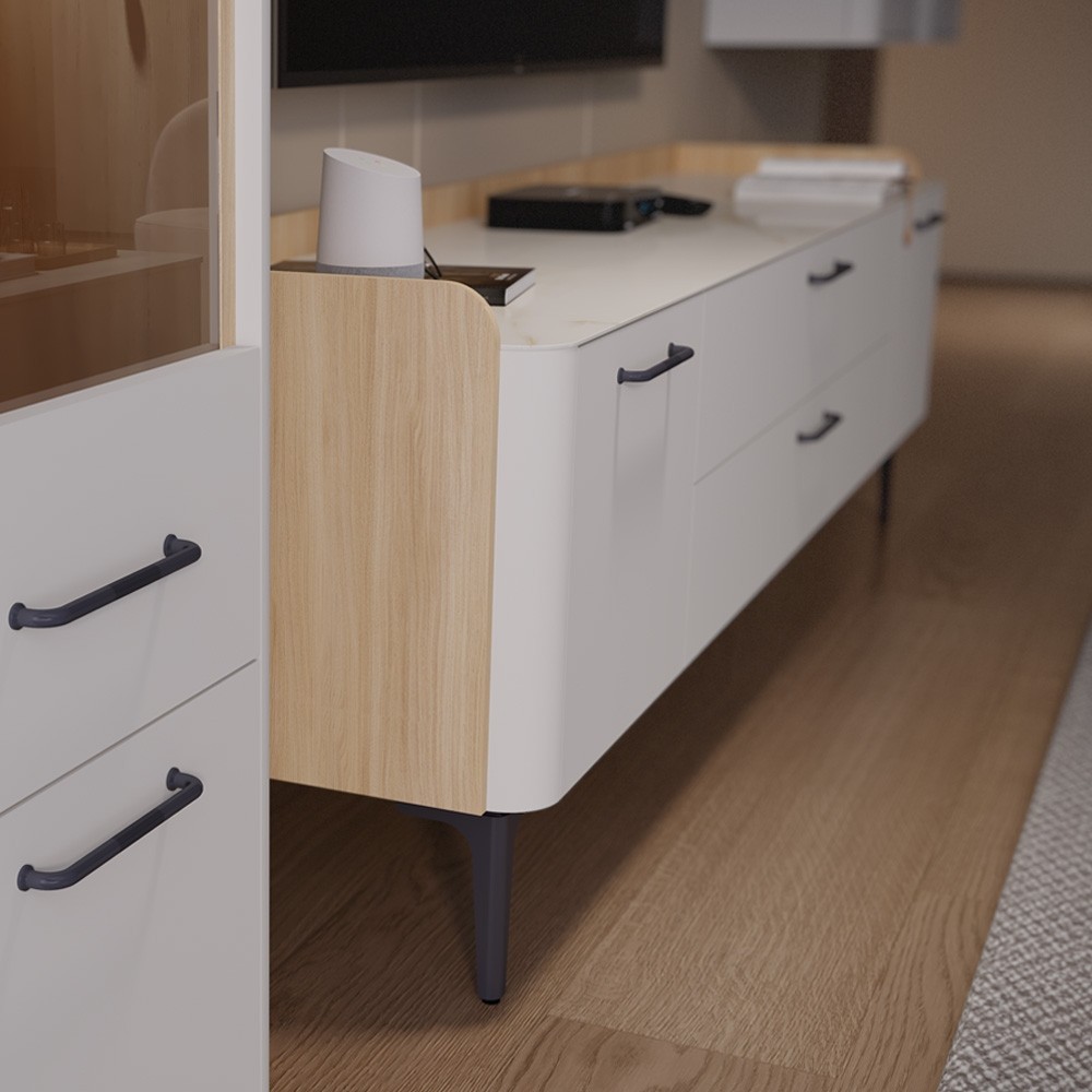 Moderan, elegantan i funkcionalan TV ormarić RADDA AIR unosi lakoću i harmoniju u vaš dnevni boravak. Usklađenost boje Pepper White i dekora drva stvara ugodan i vizualno prozračan prostor, dok staklena površina dodaje dašak luksuza. Visoke nožice omogućuju lakše čišćenje, a meko zatvaranje jednostavniju svakodnevnu upotrebu.