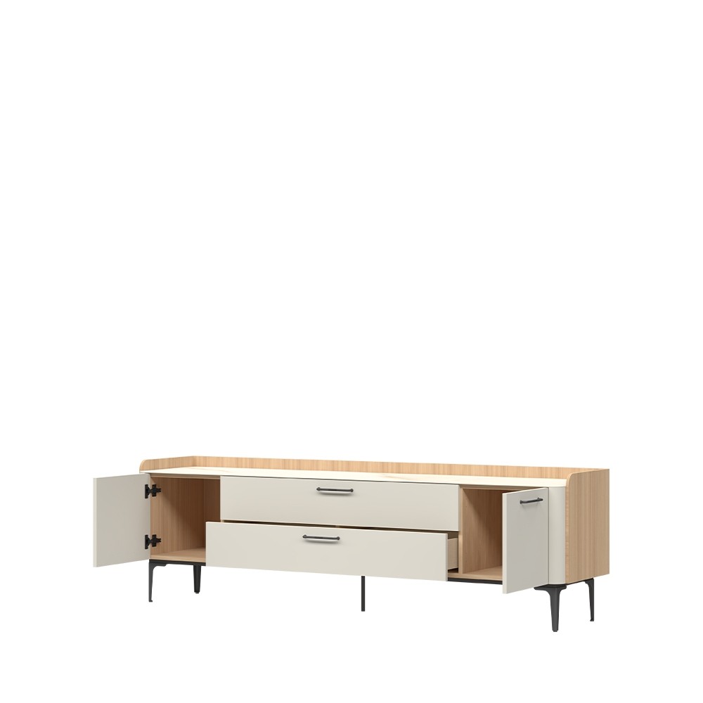 TV ormarić RADDA AIR unosi lakoću i harmoniju u vaš dnevni boravak. Kombinacija svijetlih boja stvara ugodan i vizualno prozračan prostor, visoke nožice omogućuju lakše čišćenje, a meko zatvaranje jednostavniju svakodnevnu upotrebu. Staklena površina dodaje dašak luksuza, dok antracitne ručkice i nožice osiguravaju moderan i profinjen izgled.