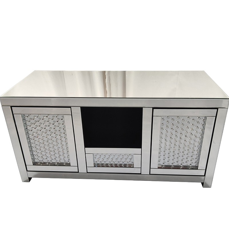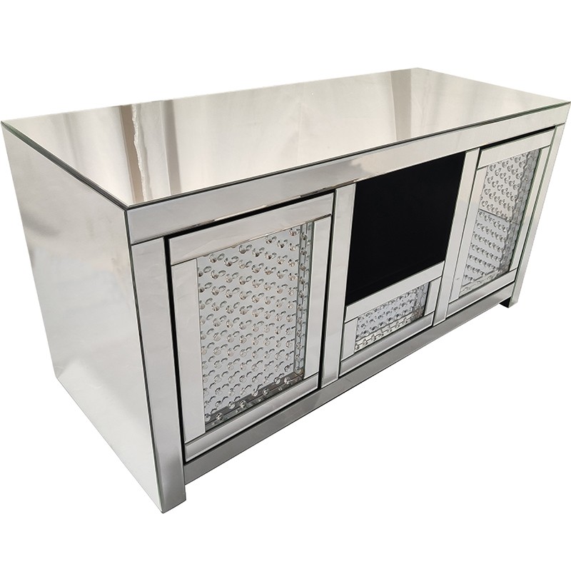 Opremite dnevni boravak sa prestižnim TV regalom PROVANSA u glam izgledu, koji će definitivno privući pažnju svakog gosta! Regal je izrađen od kvalitetnog MDF materijala te je prevučen sa staklom u srebrnim detaljima. Regal vam nudi puno prostora za pohranu revija, daljinskih upravljača, knjiga te ostalih sitnica. Sa svake strane se nalazi ormarić s vratima, a u sredini ladica te otvorena polica, namjenjena za elektronske uređaje. Ladica sadrži funkciju tihog zatvaranja, a unutrašnjost ormarića obojana je u crnu boju.