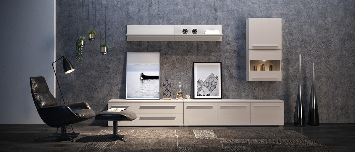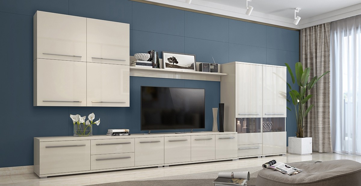 Elementi dnevnih sob Radda Piano so na voljo v minimalističnem izgledu v kombinaciji tople bež barve v visokem sijaju ter kromiranih ročk in nogic. Minimalistični dizajn vam poleg elegantnega videza nudi tudi preprosto kombiniranje z ostalim pohištvom in dekorativnimi elementi vašega doma, saj se lepo poda v vsak prostor.