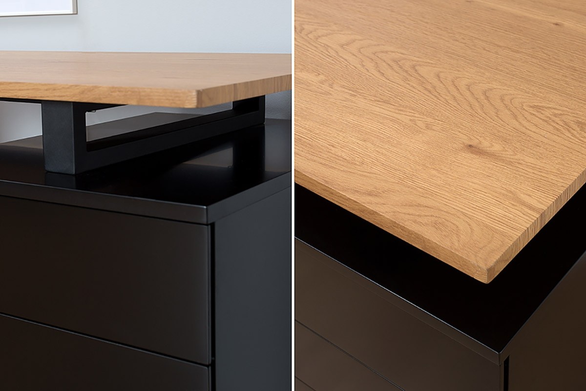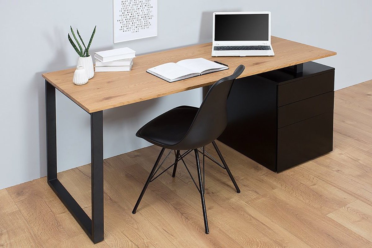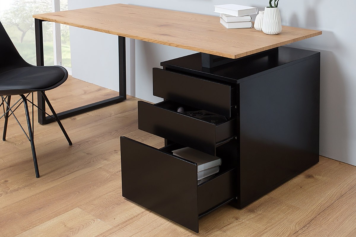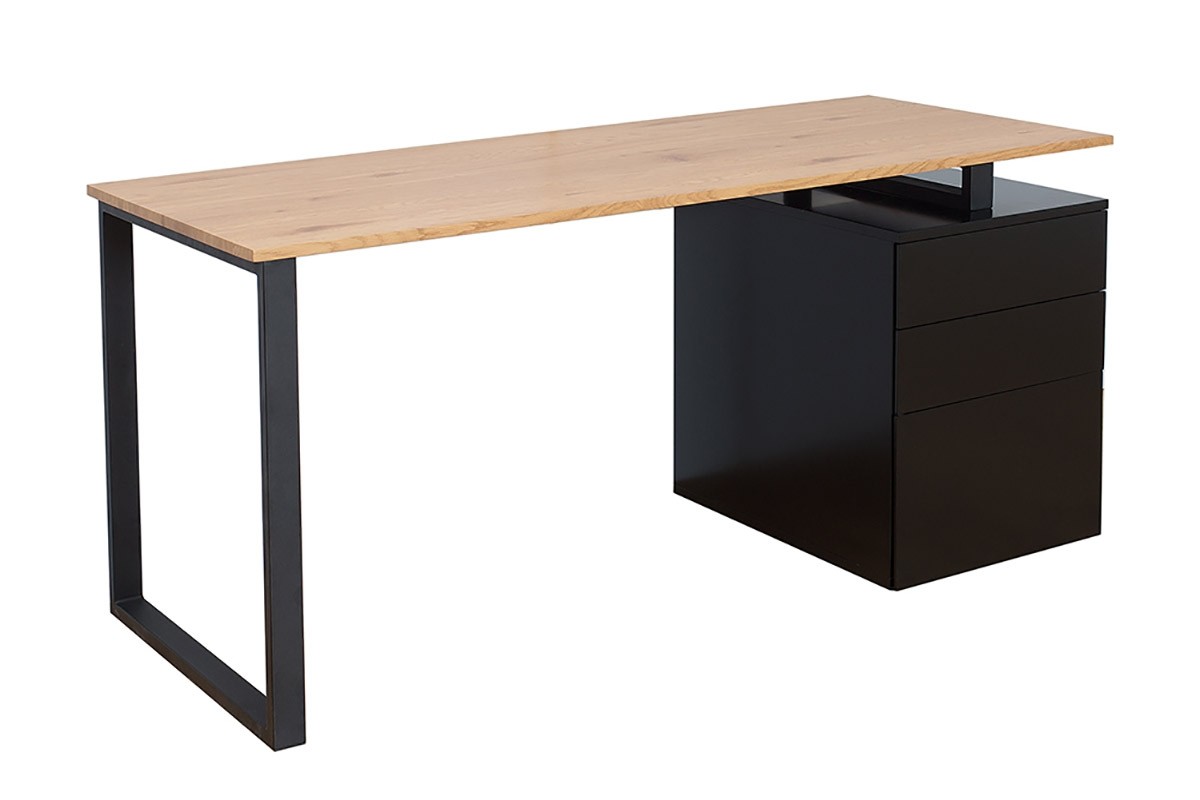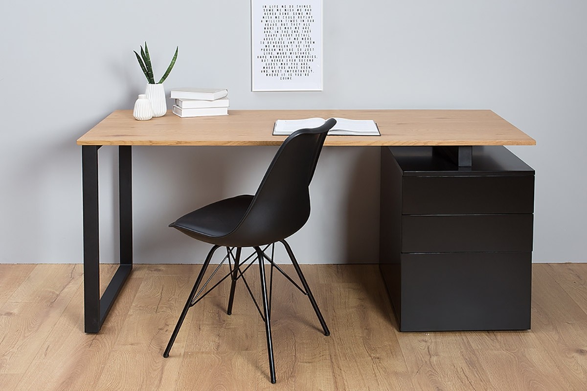 UREDSKI STOL STYLO moderan je uredski stol u kombinaciji crne boje i boje hrasta, koja čini vaš dom ljepšim i modernijim. Stol vam nudi veliku radnu površinu jer je gornja ploča širine 160 cm i dubine 70 cm. Uključen je i dodatni dio s tri ladice u crnoj boji u koje možete spremiti sve vaše papire i pribor, što vam omogućuje održavanje čiste i organizirane radne površine. Između ladica i gornje ploče stola nalazi se prostor koji može služiti kao polica za odlaganje raznih predmeta. Druga strana stola izrađena je od čelika u crnoj boji.