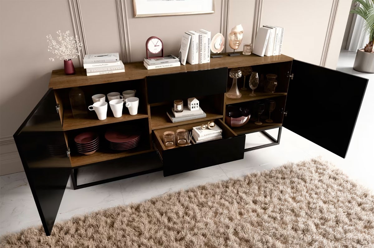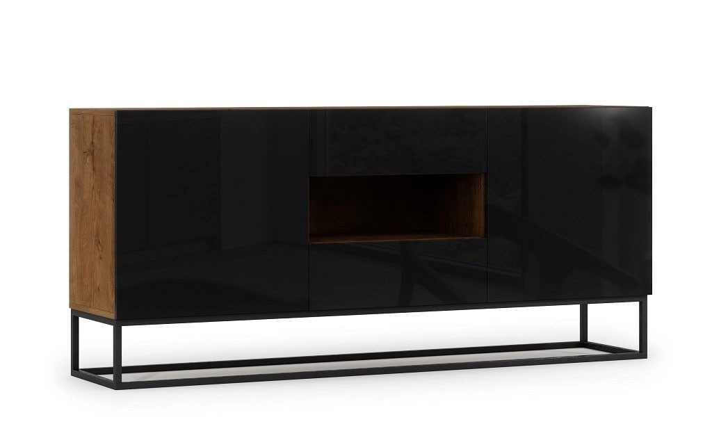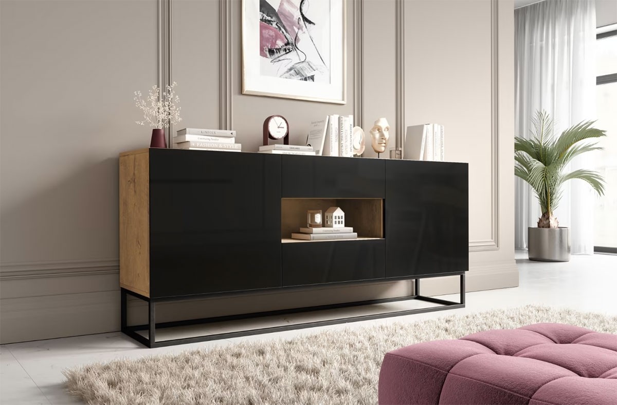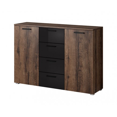 Velika komoda AVORIO praktična je i modernog izgleda. Komoda sadrži puno prostora za pohranu, jer nudi dvije ladice, dvoja vrata i policu na koju možete spremiti knjige, društvene igre i ostalo. Dostupna je u kombinaciji hrasta i crne boje visokog sjaja.