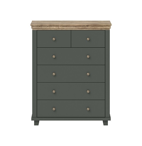Velika komoda EVORA dostupna je u kombinaciji zelene boje i hrasta Lefkas koja će uljepšati spavaću sobu i učiniti je modernijom. Velika komoda sadrži 6 ladica u koje možete pohraniti odjeću, donje rublje i druge stvari koje želite organizirati.
