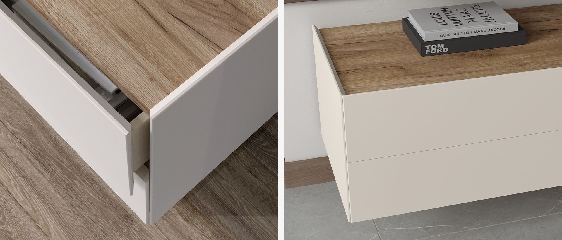 Posebnost kolekcije SKY45 je precizno spajanje fronti i stranica pod kutom od 45°, što namještaju daje jedinstven i moderan izgled. Gornju ploču vitrine krasi drveni dekor hrasta tobacco koji prostoru daje toplinu i prirodni dojam. Unutrašnjost vitrine dodatno je ukrašena tekstilnim uzorkom, što naglašava njezin profinjeni karakter.