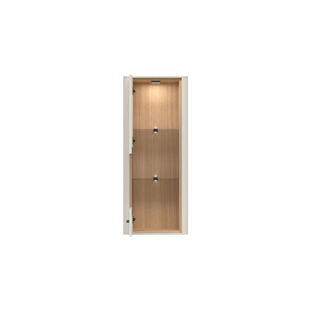 Viseća vitrina RADDA AIR sa staklenim vratima omogućuje diskretan pogled u unutrašnjost vitrine, a staklene police i LED rasvjeta dodatno upotpunjuju izgled vitrine. Uključuje mehanizam mekog zatvaranja koji omogućuje jednostavnu svakodnevnu upotrebu.