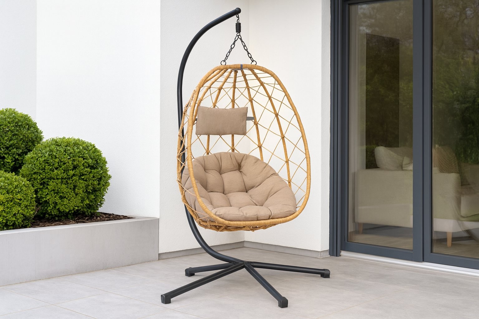 Viseća fotelja Porar (bež s bež jastukom i črnim ogrodjem) je funkcionalan komad namještaja odnosno dodatak za dom koji spaja praktičnost i uredan izgled. Boja u nijansi bež s bež jastukom i črnim ogrodjem lako se uklapa u različite ambijente.