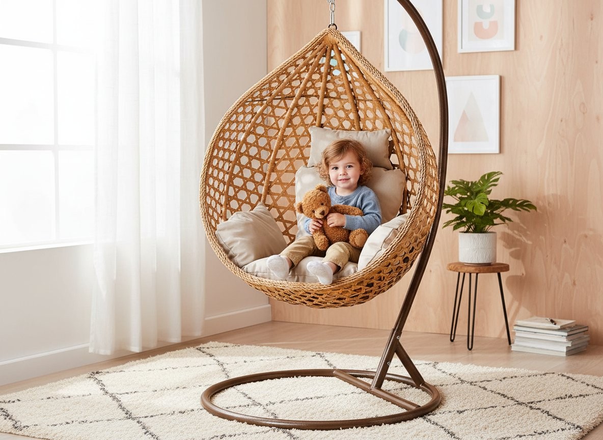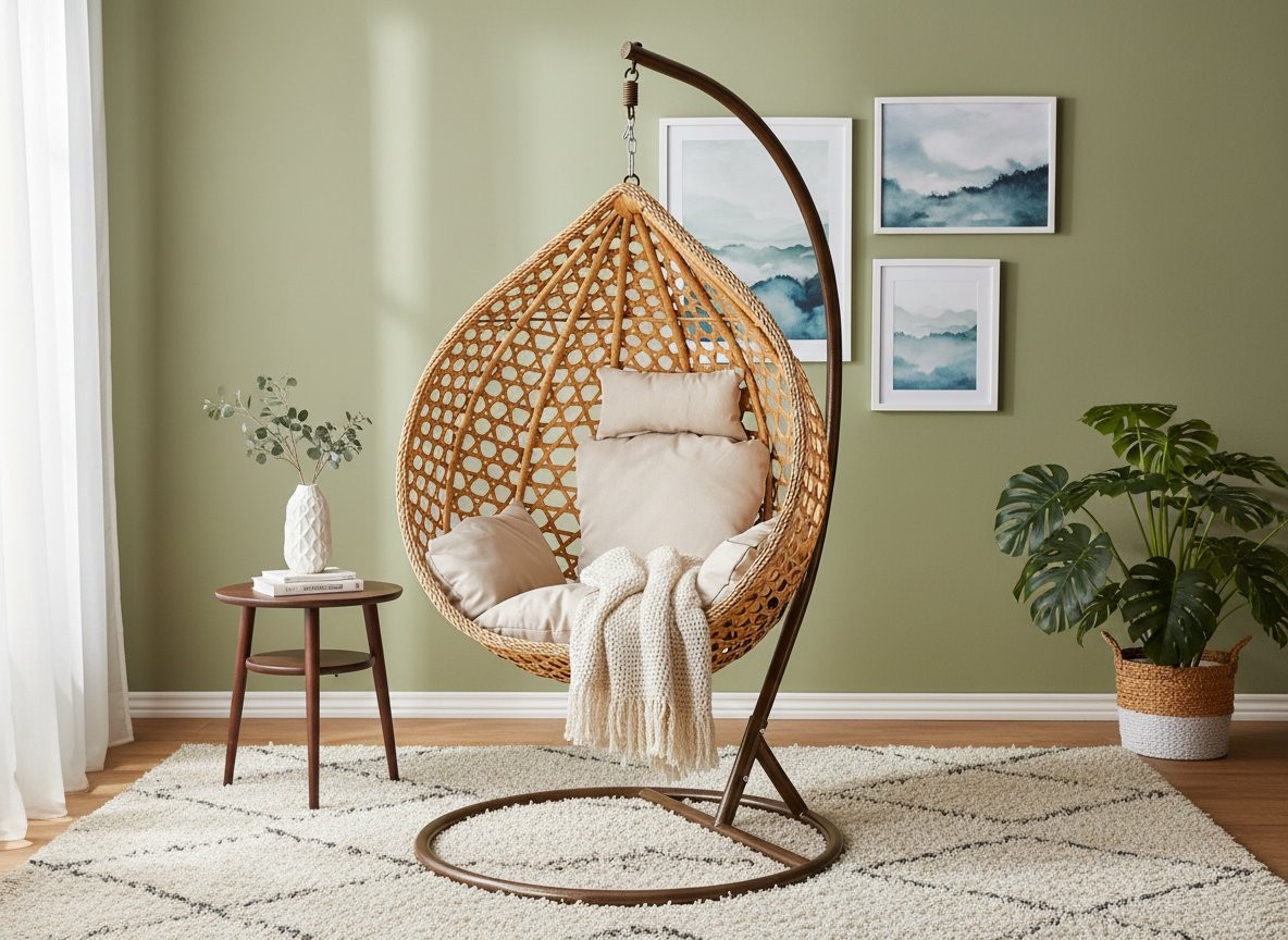 Kokonska oblika objame telo i stvara udoban kutak za odmor. Prašno barvano jekleno ogrodje skrbi za stabilnost, tehnoratan pa je v opisu naveden kot trpežen material z odpornostjo na UV-sevanje.