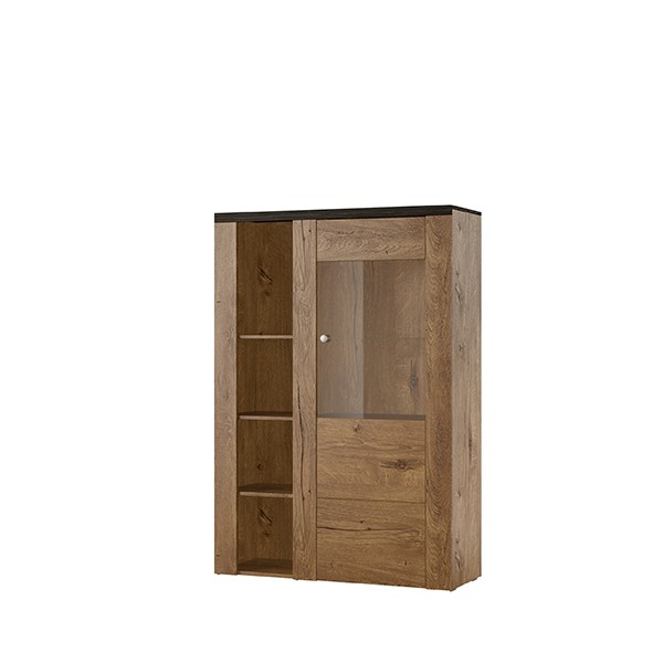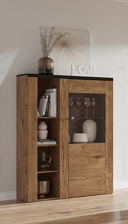Visoka vitrina LARONA dostupna je u boji hrasta lefkas koja se savršeno uklapa u svaki dnevni boravak. Visoka vitrina sadrži staklena vrata u koja možete pohraniti omiljene stvari koje će uvijek biti na sigurnom, ali vidljivom mjestu.