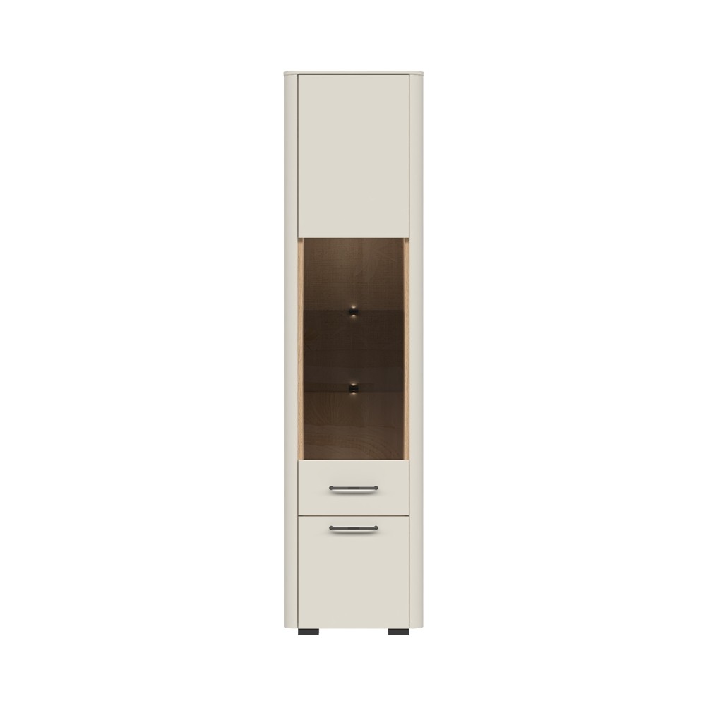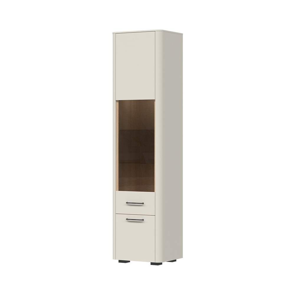 Elegantna visoka vitrina RADDA AIR s parsol staklom na frontama unosi moderan i profinjen izgled u svaki dnevni boravak. Staklo omogućuje diskretan pogled u unutrašnjost vitrine, a ujedno zajedno sa staklenim policama i uključenom LED rasvjetom dodaje dašak elegancije.
