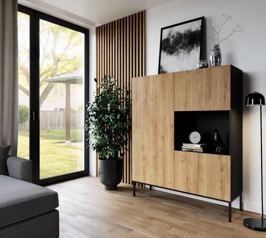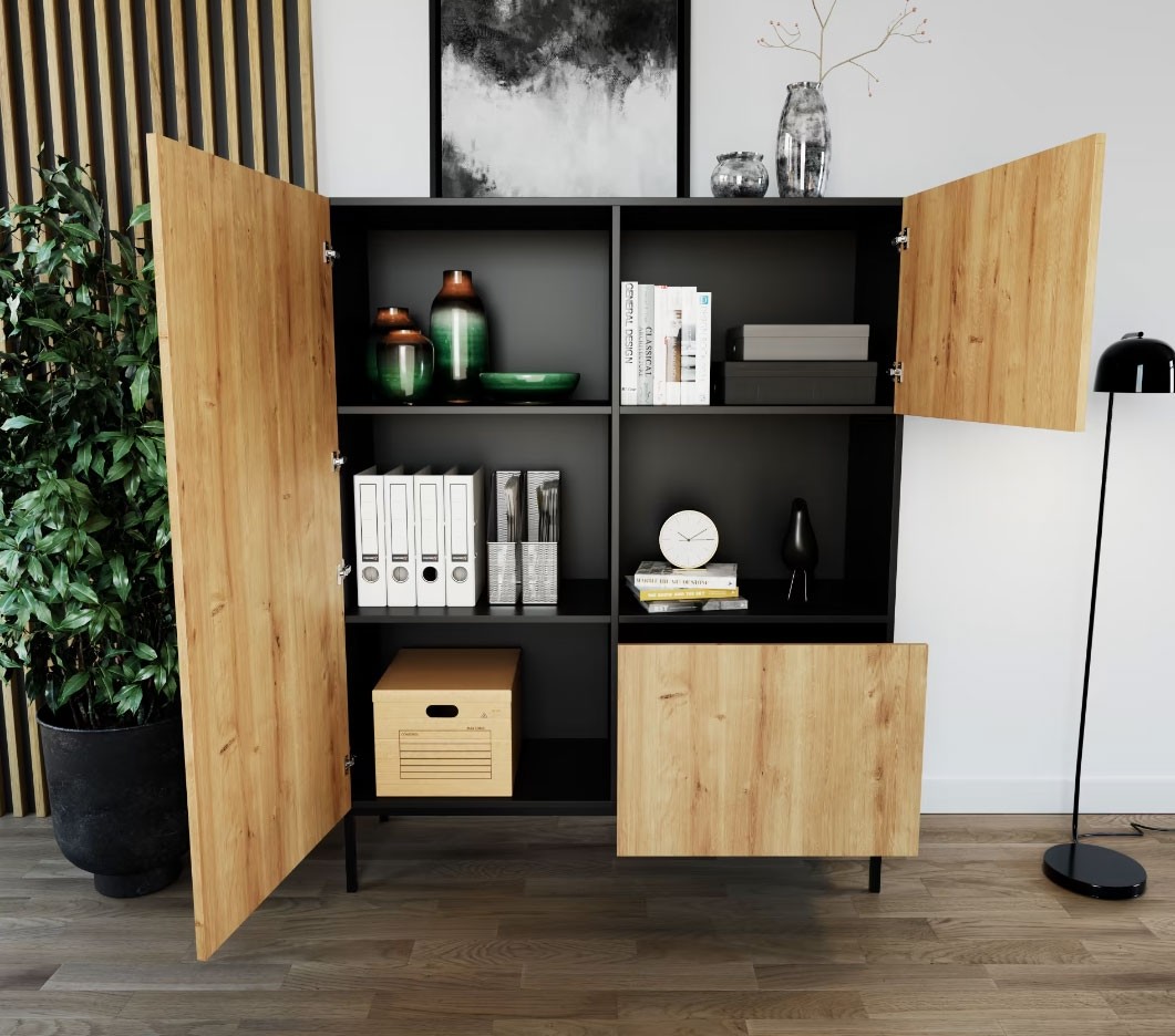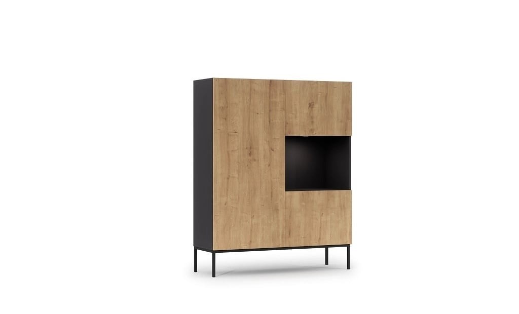 Moderna i prostrana vitrina LANZZI nudi puno prostora za pohranu, gdje možete pohraniti društvene igre, čaše, tanjure ili postaviti ukrasne predmete na otvorenu policu vitrine za ugodniji izgled. Vitrina je dostupna u kombinaciji hrasta i mat crne boje koja se savršeno uklapa u moderne dnevne sobe.