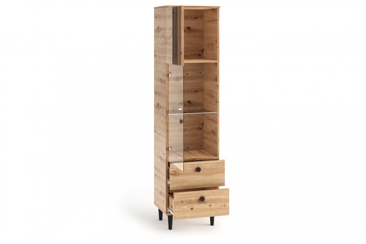 Vitrina LIVIA 05 je elegantan i funkcionalan komad namještaja za svaki moderan dom. S prirodnim izgledom hrasta Artisan i kontrastnim crnim detaljima, unosi toplinu i suvremeni dizajn u vaš prostor.
