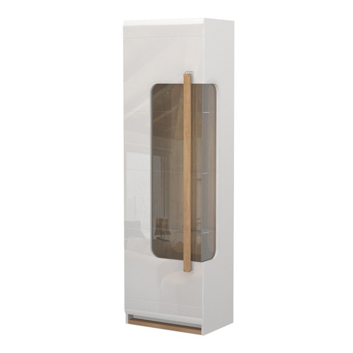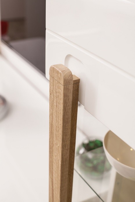 Okvir vitrine je napravljen iz iverice (18 mm). Prednje stranice su napravljene iz MDF materijala visokog sjaja, u bijeli boji i kaljenog stakla. Ručka je napravljena iz MDF materijala u nebraska hrast boji. U vitrini se nalaze tri staklene police.