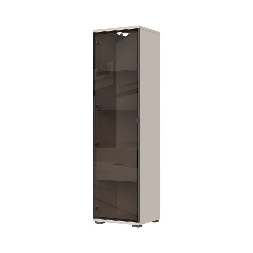 Vitrina Radda Opera V52-1AL je popolna izbira za vsak dom, ki si želi elegantne in funkcionalne rešitve za shranjevanje. S svojim modernim dizajnom in prefinjenimi detajli se odlično ujema z različnimi ambienti. Lakirana v nežnem mat UV laku v barvi Kašmir in dopolnjena z aluminijastim okvirjem s steklom, prinaša prestižen videz in brezčasno eleganco. Notranjost v dekorju Textil zagotavlja sofisticiran kontrast in dodaja pridih razkošja. Vgrajena LED osvetlitev poudarja vsebino vitrine in ustvarja prijetno vzdušje v prostoru.