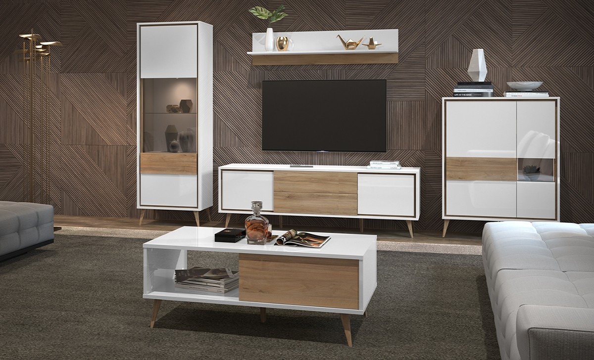Vitrina je na voljo v kombinaciji kristalno bele barve in pacifičnega oreha v visokem sijaju. Pohištvo v visokem sijaju odbija svetlobo in zato v domu ustvari bolj svetel in zračen prostor, zato boste vanj z veseljem povabili vaše najdražje.