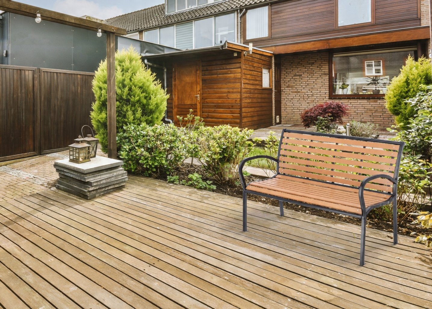 Klop združuje jeklen okvir s prašno prevleko i plastične letve, zato povezuje stabilnost ter enostavnejše vzdrževanje. V opisu je poudarjena kot praktičen i hkrati okrasen element zunanje ureditve.