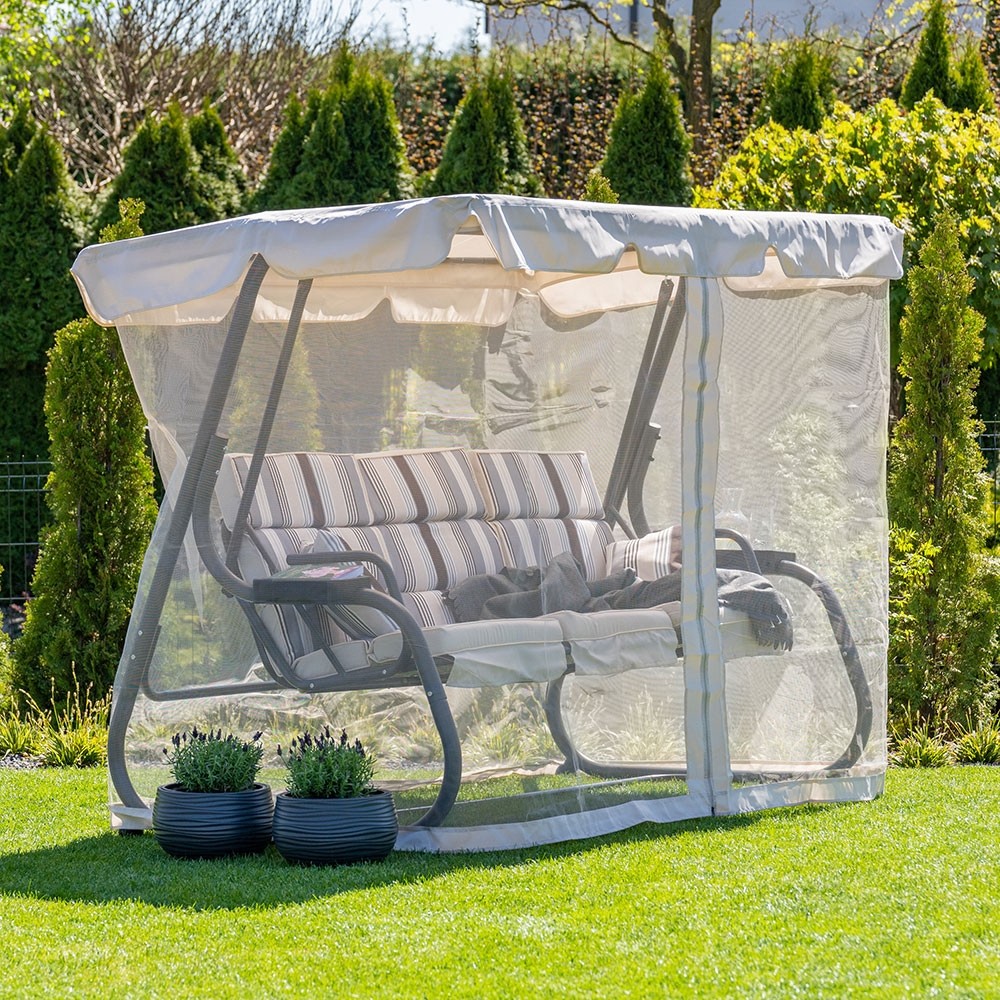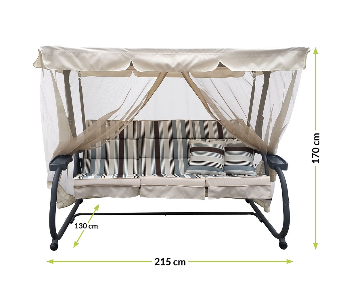 Opremite svoj vrt udobnim i visokokvalitetnim vrtnim ljuljačkama INES. Ljuljačka nudi opuštanje i prostor za druženje s vašim najmilijima. S obzirom da se radi o vanjskom namještaju, sadrži i mrežu za komarce, tako da će vaš odmor biti doista kvalitetan i neometan. Dostupna je u bež boji i izrađena je od metalnog okvira i tkanine od poliestera.