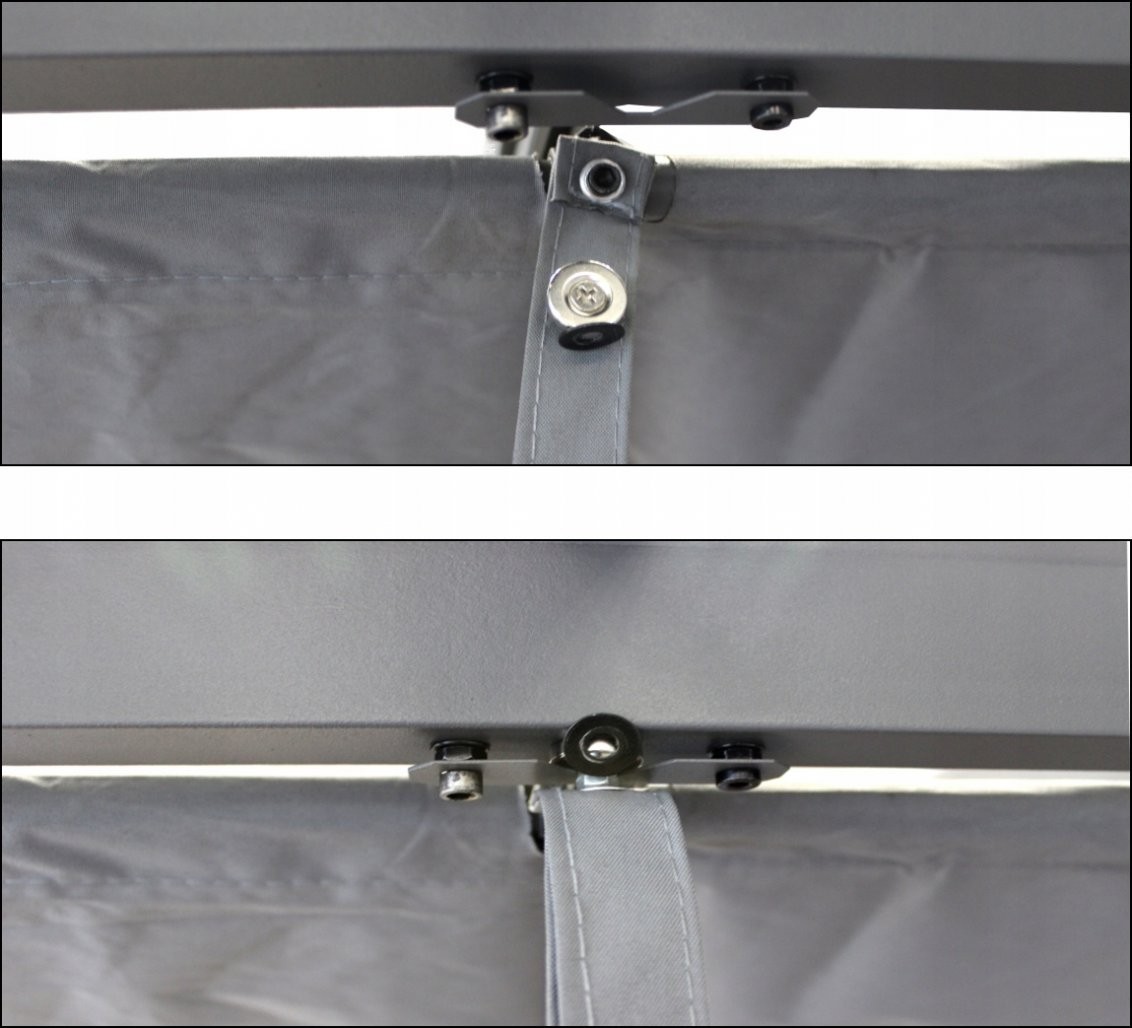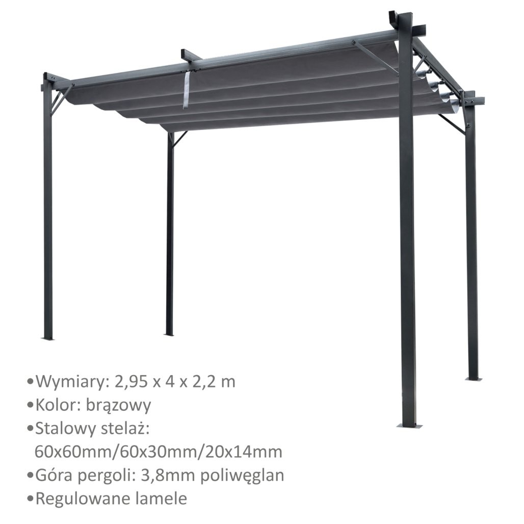 Model meri 300 x 400 x 230 cm i pokrije večjo površino za vanjsku upotrebu. Pokrivalo iz poliestra z maso 300 g/m² dopolnjuje odpornost konstrukcije. Montaža traja približno 30 minut. Za pravilno postavitev je pergolo treba pritrditi v podlago.